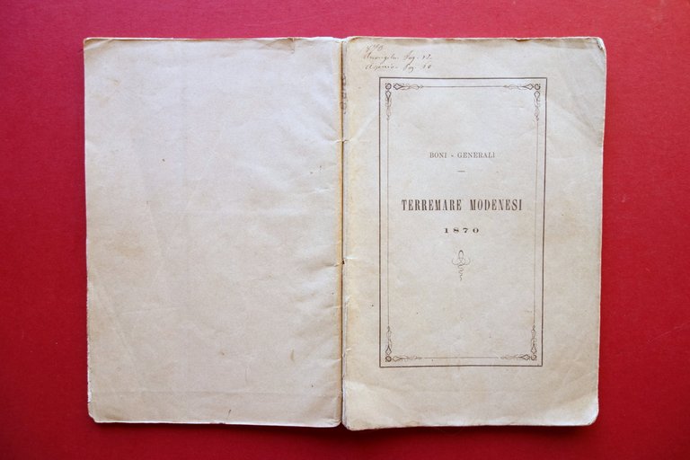 Riassunto storico - critico degli studii fatti sulle Terremare e palafitte modenesi dalla loro scoperta fino al presente e sull'antropologia preistorica nella sua connessione collo studio delle Terremare del Dottor Carlo Boni *** Avanzi Animali delle Terremare del modenese nota del prof. Giovanni Generali Soliani, Modena 1870; cm 23x15; pp. 98 più 7 belle tavv. in b/n ripiegate al termine del testo (6 della lit. Ferrari, una della lit. Cappelli); brossura ed. d'attesa con un paio di brevi note d'epoca alla parte superiore della brossura anteriore. Condizioni di conservazione Esemplare complessivamente in buono stato con tracce d'uso, brossura d'attesa con qualhe minuscolo leggerissimo alone, dorso con fessurazioni di alcuni cm, esemplare compatto seppur delicato. Interni buoni con piccole lievi bruniture e, ad alcune pagine, vecchie annotazioni / segnetti d'epoca a matita, in rari casi a penna (note di studio; vedi foto). Rara pubblicazione voluta dall'allora Consiglio Provinciale di Modena, e da esso offerta agli illustri scienziati membri corrispondenti nella 5° sessione del congresso internazionale di antropologia ed archeologia preistorica convocata in Bologna". Con 7 belle tavole incise in bianco e nero al termine del testo. SETT222.L21469 N "