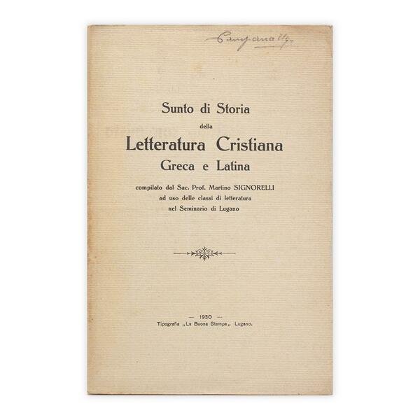 Autore: Sac. Prof. Martino Signorelli Titolo: Sunto di Storia della Letteratura Cristiana, Greca e Latina Sottotitolo: Ad uso delle classi di letteratura nel Seminario di Lugano Edizione: Tipografia "La buona stampa" Lugano 1930 Dimensioni: 14 x 21 cm c.a. Pagine: 127 Copertina: Brossura Condizioni: Buone come da foto