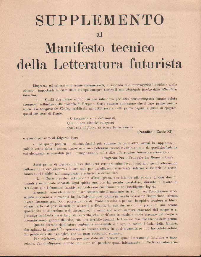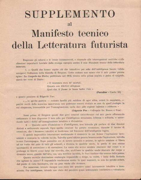 Manifesto (mm 290x230), pp. (4), in 8 punti (con incluso il primo brano esemplificativo: "Battaglia. peso + odore"). Nel Manifesto tecnico della letteratura futurista' gli inviti ad odiare l'intelligenza, sintomo di morte, per dar libero corso all'intuizione procurarono a Marinetti accuse di bergsonismo. In risposta il nostro lancia il "Supplemento" che contiene straordinarie riflessioni.. Come il Manifesto anche il Supplemento apparve in volantini. Così Salaris Storia del Futurismo, p. 42. "Edizione originale". Cfr. anche Tonini I manifesti del futurismo italiano, p. 35, n. 51.1.Ben conservato.