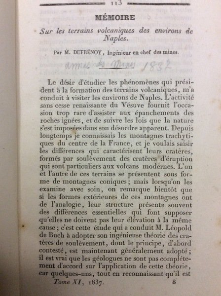 In-16 gr. (mm. 187x113), 3 fascicoli in 1, brossura muta mod., pubblicati nell'opera Annales des Mines, III serie, Tomo XI, alle pp.: 113-158 // 369-386 // 389-434. Mancano le 3 tavole. Vi sono contenuti: Nature géologique du terrain de la campagne de Naples - Terrains trachytiques des Champs-Phlégréens - Groupe du Vésuve: de la Somma, du Vésuve - Phénomènes qui ont accompagné l'ensevelissement d'Herculanum et de Pompei. Cfr. Furchheim, p. 50. Armand-Pierre Dufrenoy (1792-1857), geologo e mineralogista francese. Nel 1823, con E. de Beaumont, iniziò una serie di escursioni per redigere la carta geologica di Francia (1836), che fece poi seguire dal testo esplicativo (1836-41). Professore e direttore dell'Ecole des mines di Parigi, fu eletto membro dell'Accademia delle scienze (1840). Si hanno di lui notevoli lavori sulla geologia del Massiccio Centrale, sui terreni secondarî del Mezzogiorno della Francia e sui giacimenti minerarî anche esteri. Sono, tra gli altri, da ricordare: Traité de minéralogie (Parigi 1884-87); "Des terrains volcaniques des environs de Naples" (Parigi 1837-38) in cui interpreta, secondo una nuova teoria, la formazione del monte Somma e del Vesuvio. Cfr. Encicl. Italiana (1932).Alc. fioriture o arross., peraltro buon esemplare.