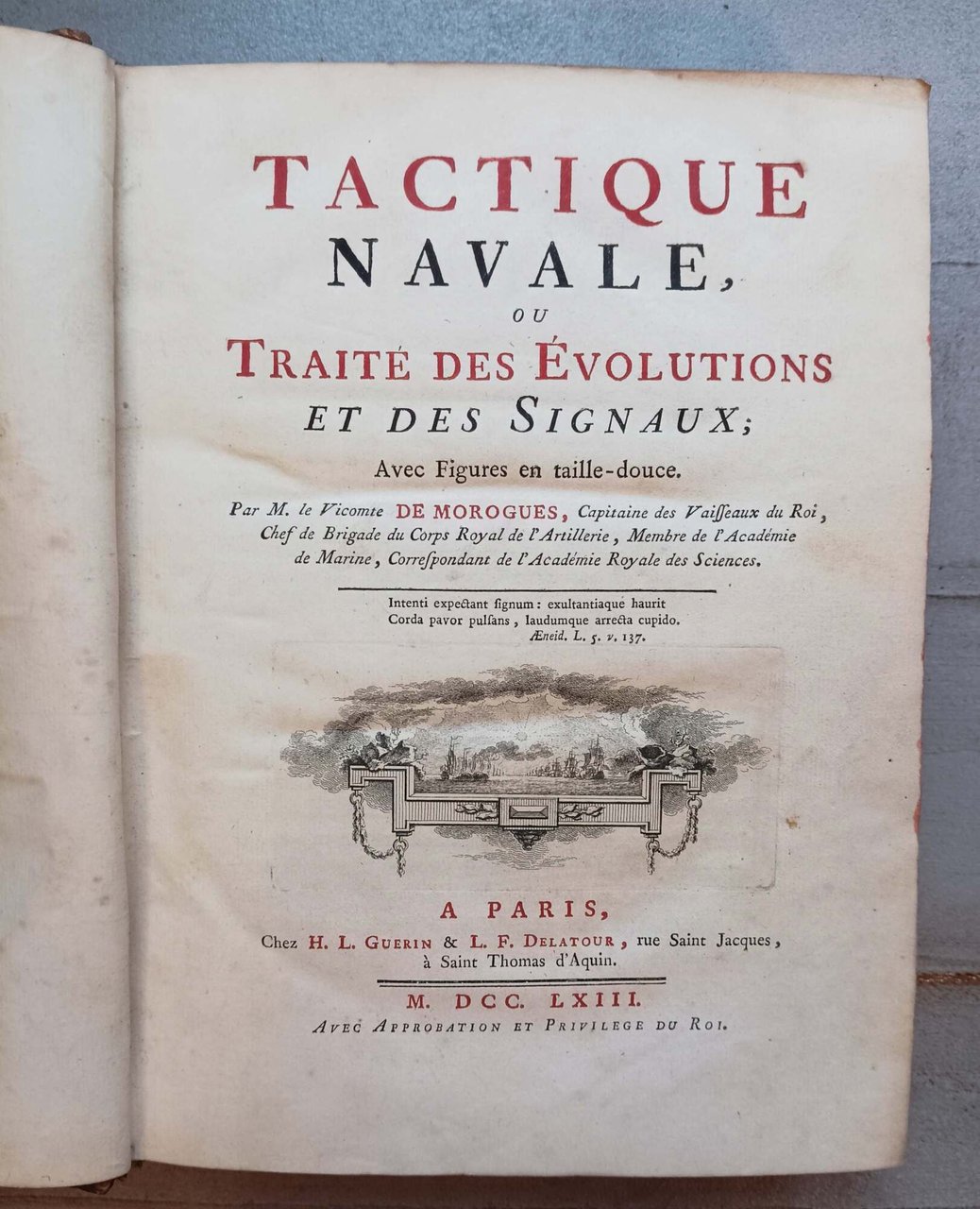 >in-4, pp. (4), X, 481, (2); vignetta sul titolo, bella fig. all'inizio del testo, 49 tavole a p. pagina fuori testo, il tutto finemente inc. in rame, illustranti 133 posizioni di posizioni, tattica navale e segnali. Leg. coeva p. pelle marmorizz., dorso a nervi con titolo e fregi oro, tagli rossi (lievi difetti). Prima edizione di questo copioso trattato e fondamentale manuale che istruisce e spiega in dettaglio tutti i segnali notturni e diurni utilizzati dalla marina di guerra. L'opera si divide in due parti, la prima sulle evoluzioni, la seconda sui segnali e ordini che una armata navale deve conoscere e saper eseguire perfettamente. L'autore fu importante ufficiale della marina francese e il primo direttore dell'Accademia Navale fondata nel 1752. Buon esemplare, su carta forte con grandi margini (segni di tarlo nei margini dei fogli di centro del volume). Polak 826. Brunet VI, 8517. Scott 316.