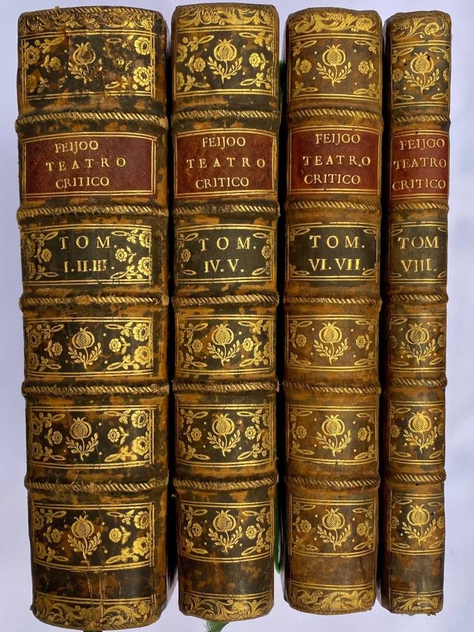 <span style="font-style: normal;">8 volumi in 4 tomi (cm. 23,3), belle legature in piena pelle maculata con titolo in oro su tasselli marocchini e fregi floreali in oro ai dorsi, tagli rossi, contropiatti marmorizzati; etichette di scaffalatura ai risguardi; carte in ottimo stato e fresche. Rara edizione originale della prima traduzione italiana più completa di questo imponente capolavoro del più grande illuminista spagnolo. E' uno dei testi più pubblicizzati e controversi del Settecento, critica una molteplicità di idee contemporanee con chiara e trasparente razionalità in favore del rinnovamento della cultura [EC V, 1131]. Feijoo (o Feyjoo) si procurò molti nemici criticando, anche pesantemente, la superstizione e l'ignoranza dei monaci, i privilegi e le licenze del clero, l'abuso degli esorcismi, la facilità a proclamare i miracoli. Elenco degli associati in fine. Per una storia delle traduzioni italiane settecentesche dell'opera, cfr. Mombelli Davide, </span><i>La polémica hispano-italiana</i>, Editorial Verbum 2021, p. 33-34. Si segnala al n. 300 del <i>Repertorio di libri di carattere alchemico, cabalistico, magico e curioso</i> posseduti dalla Biblioteca Universitaria di Genova segnala un esemplare con ritratto, qui e altrove assente. Superbo esemplare. (SH2)