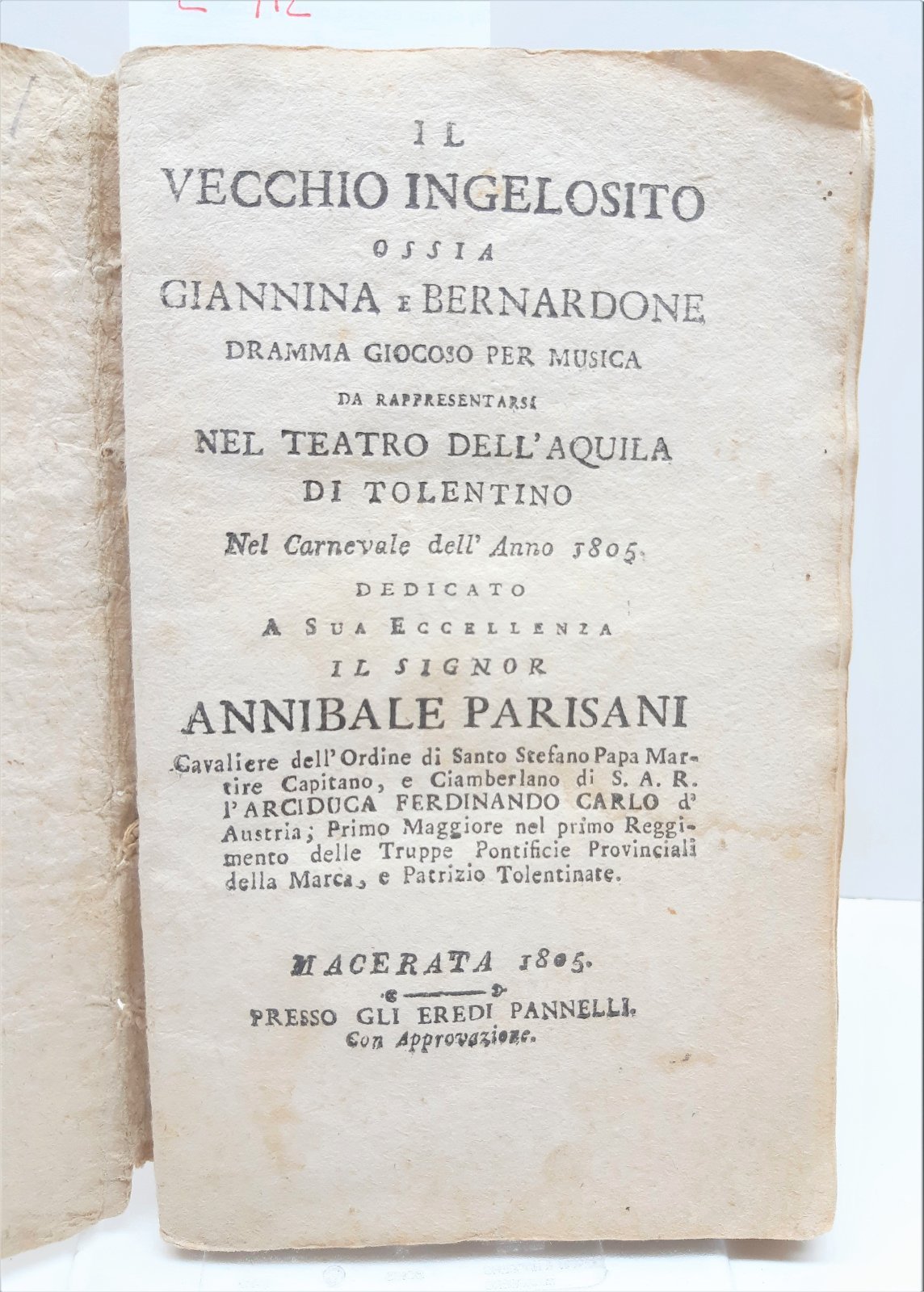 Teatro Il vecchio ingelosito ossia Giannina e Bernardone dramma giocoso per musica da rappresentarsi nel Teatro dell'Aquila di Tolentino nel Carnevale dell'anno 1805 dedicata a sua eccellenza il signor Annibale Parisani Macerata eredi Pannelli 1805