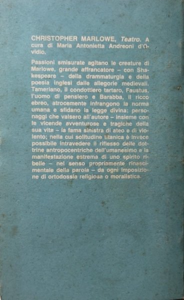 Soggetti: Drammaturghi britannici, Questione marlowiana, Libri vintage, Fuori catalogo, Classici, Poesia, Critica, Teatro Drammatico, Inghilterra, Letteratura drammatica inglese, Cultura anglosassone, Drammaturgia, Tragedie, Cinquecento, Seicento, Commedie, William Shakespeare, Età elisabettiana, Teatro elisabettiano, 1558-1625, Magia nera, Diavolo Mefistofele, Lucifero, Vizi capitali, Ben Jonson, Calvinismo, Anti-Calvinismo, Belzebù, Teologia, Scienza, Filosofia, Soliloquio, Angeli, Edoardo II, Edward II, Il massacro di Parigi, The Massacre at Paris, Zenocrate, Gotico, Barabba, Cavalieri, Compagnia di Lord Strange, Machiavelli, Condottiero tartaro, Allegorie medievali, Ateismo, Rinascimento, Umanesimo, Blank verse, Poetica, Passioni, British dramatists, Marlowian question, Books out of print, Classics, Poetry, Criticism, Drama Theater, England, English dramatic literature, Anglo-Saxon culture, Dramaturgy, Tragedies, Sixteenth, Seventeenth century, Comedies, Elizabethan Age, Elizabethan Theater, Black Magic, Devil, Mephistopheles, Lucifer, Capital Vices, Ben Jonson, Calvinism, Anti-Calvinism, Beelzebub, Theology, Science, Philosophy, Soliloquy, Angels, Gothic, Barabbas, Knights, Company of Lord Strange, Tartar Leader, Medieval Allegories, Atheism, Renaissance, Humanism, Blank verse, Poetics, Passions