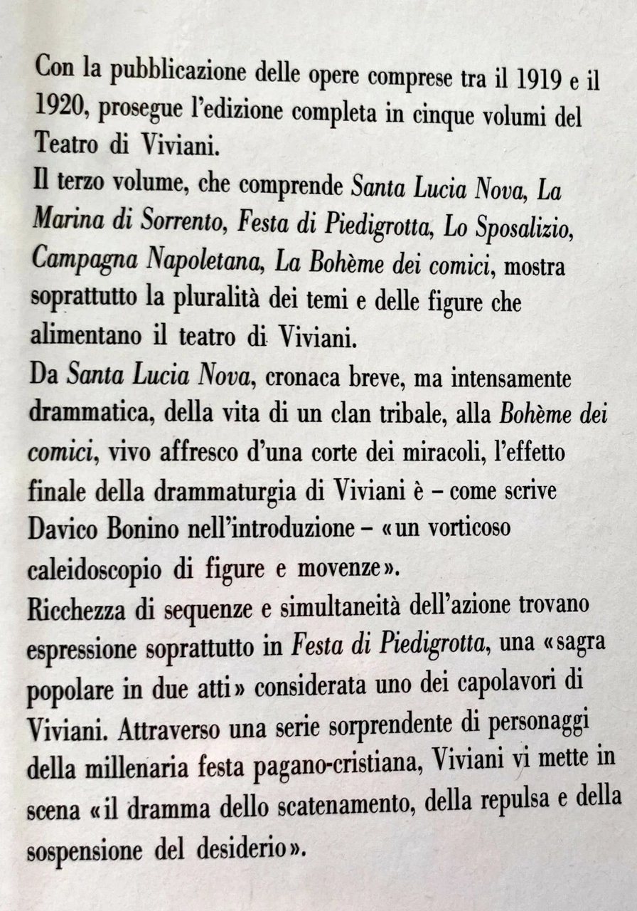 Con la pubblicazione delle opere comprese tra il 1919 e il 1920, prosegue l'edizione completa in cinque volumi del Teatro di Viviani. Il terzo volume, che comprende Santa Lucia Nova, La Marina di Sorrento, Festa di Piedigrotta, Lo Sposalizio, Campagna Napoletana, La Bohème dei comici, mostra soprattutto la pluralità dei temi e delle figure che alimentano il teatro di Viviani.