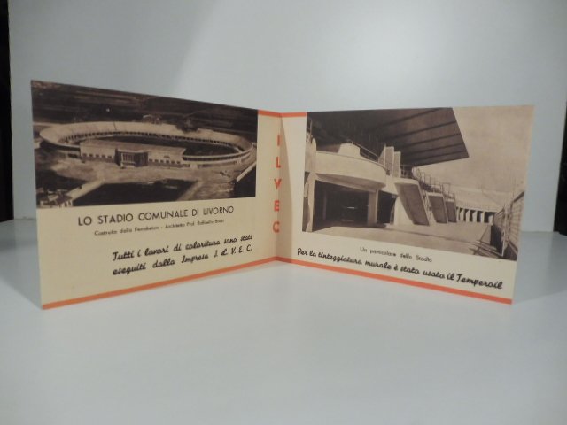 Pieghevole a 2 falde, cm 30 x 10,5. Timbro postale. Le 2 facciate interne presentano 2 immagini dello stadio comunale di Livorno, all'epoca, appena realizzato su disegno dall'Architetto Raffaello Brizzi