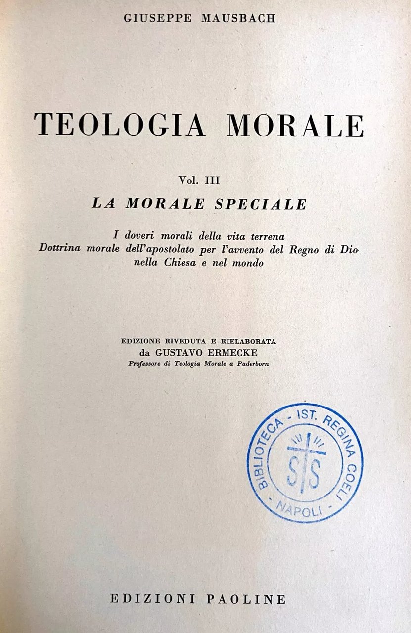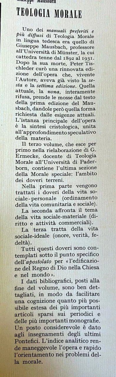 Uno dei manuali preferiti e più diffusi di Teologia Morale in lingua tedesca era quello di Giuseppe Mausbach, professore all'Università di Münster, la cui cattedra tenne dal 1892 al 1931. Dopo la sua morte, Peter Tischleder curò una rinnovata edizione dell'opera che, vivente l'Autore, aveva già visto la sesta e la settima edizione. Quella attuale, la nona, interamente rifusa, prende le mosse dal testo della prima edizione del Mausbach, dandole però quella forma richiesta dalle esigenze attuali. L'istanza principale dell'opera è la sintesi cristologica, unita all'approfondimento speculativo della materia. Il terzo volume, che esce per primo nella rielaborazione di G. Ermecke, docente di Teologia Morale all'Università di Paderborn, contiene l'ultima sezione della Morale speciale: l'ambito dei doveri terreni. Nella prima parte vengono trattati i doveri della vita sociale-personale (ordinamento della vita comunitaria e sociale). La seconda affronta il tema della vita sociale-materiale (diritto e attività commerciali). La terza tratta della vita sociale-ideale (onore, verità, fedeltà). Tutti questi doveri sono contemplati sotto il punto specifico dell'apostolato per «l'edificazione del Regno di Dio nella Chiesa e nel mondo». I dati bibliografici, posti alla fine del volume, sono ben dettagliati, in modo da facilitare una cognizione quanto più possibile estesa dei più importanti articoli sparsi sui periodici e delle più importanti monografie. Un posto considerevole è dato agli insegnamenti degli ultimi Pontefici. L'indice analitico rende maneggevole l'opera e rapido l'orientamento nei problemi della morale.