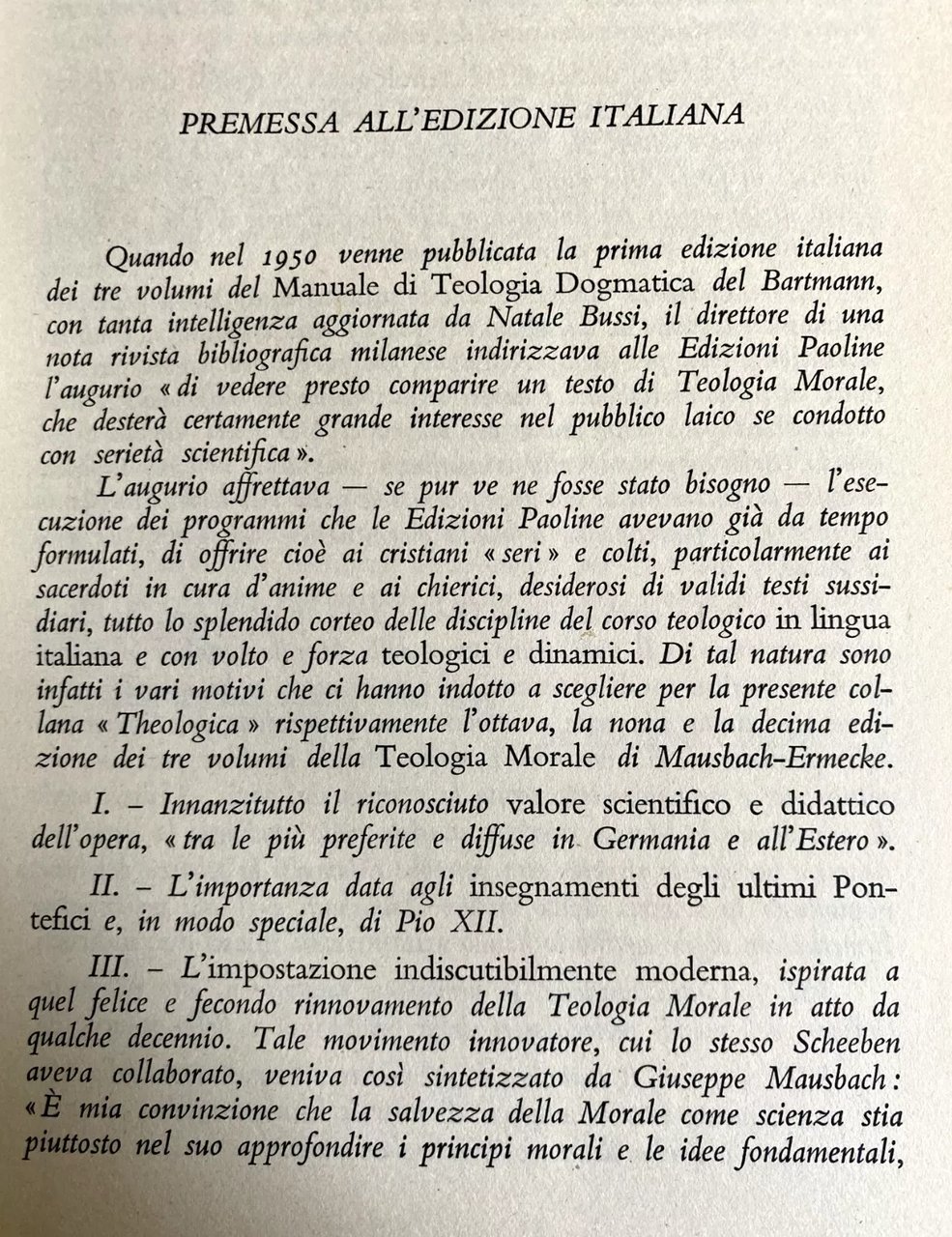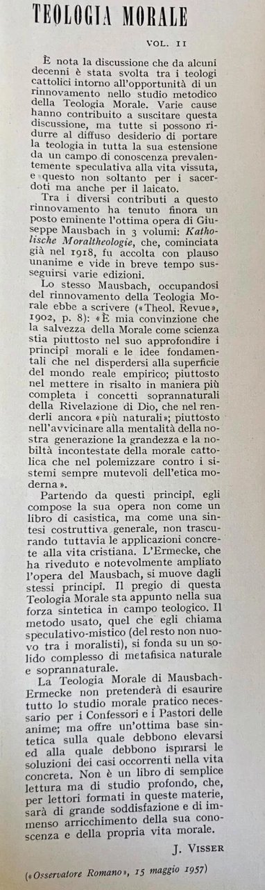 È nota la discussione che da alcuni decenni è stata svolta tra i teologi cattolici intorno all'opportunità di un rinnovamento nello studio metodico della Teologia Morale. Varie cause hanno contribuito a suscitare questa discussione, ma tutte si possono ridurre al diffuso desiderio di portare la teologia in tutta la sua estensione da un campo di conoscenza prevalentemente speculativa alla vita vissuta, e questo non soltanto per i sacerdoti ma anche per il laicato. Tra i diversi contributi a questo rinnovamento ha tenuto finora un posto eminente l'ottima opera di Giuseppe Mausbach in 3 volumi: Katholische Moraltheologie, che, cominciata già nel 1918, fu accolta con plauso unanime e vide in breve tempo susseguirsi varie edizioni. Lo stesso Mausbach, occupandosi del rinnovamento della Teologia Morale ebbe a scrivere («Theol. Revue», 1902, p. 8): «È mia convinzione che la salvezza della Morale come scienza stia piuttosto nel suo approfondire i principî morali e le idee fondamentali che nel disperdersi alla superficie del mondo reale empirico; piuttosto nel mettere in risalto in maniera più completa i concetti soprannaturali della Rivelazione di Dio, che nel renderli ancora più naturali»; piuttosto nell'avvicinare alla mentalità della nostra generazione la grandezza e la nobiltà incontestate della morale cattolica che nel polemizzare contro i sistemi sempre mutevoli dell'etica moderna». Partendo da questi principî, egli compose la sua opera non come un libro di casistica, ma come una sintesi costruttiva generale, non trascurando tuttavia le applicazioni concrete alla vita cristiana. L'Ermecke, che ha riveduto e notevolmente ampliato l'opera del Mausbach, si muove dagli stessi principî. Il pregio di questa Teologia Morale sta appunto nella sua forza sintetica in campo teologico. Il metodo usato, quel che egli chiama speculativo-mistico (del resto non nuovo tra i moralisti), si fonda su un solido complesso di metafisica naturale e soprannaturale. La Teologia Morale di Mausbach Ermecke non pretenderà di esaurire tutto lo studio morale pratico necessario per i Confessori e i Pastori delle anime; ma offre un'ottima base sintetica sulla quale debbono elevarsi ed alla quale debbono ispirarsi le soluzioni dei casi occorrenti nella vita concreta. Non è un libro di semplice lettura ma di studio profondo, che, per lettori formati in queste materie, sarà di grande soddisfazione e di immenso arricchimento della sua conoscenza e della propria vita morale. J. VISSER (Osservatore Romano, 15 maggio 1957).