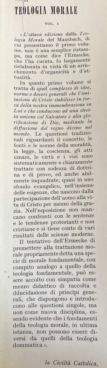 L'ottava edizione della Teologia Morale del Mausbach, di cui presentiamo il primo volume, non è una semplice ristampa, ma come dice l'Ermecke, che l'ha curata, fu largamente rielaborata in vista di un arricchimento d'organicità e d'attualità. In questo primo volume si tratta di quel complesso di idee, norme e doveri generali che l'imitazione di Cristo stabilisce in forza della nostra immembrazione in Lui e che conducono ad una stretta unione col Salvatore e alla glorificazione di Dio, mediante la diffusione del regno divino nel mondo. Le questioni tradizionali riguardanti il concetto, le fonti e le norme della moralità, la legge, la coscienza, gli atti umani, le virtù e i vizi sono sistematicamente e chiaramente trattate con sodezza di dottrina e di prove, ed anche abilmente inquadrate, quasi in uno sfondo evangelico, nell'insieme delle esigenze, che nascono dalla partecipazione dell'uomo alla via di Cristo per mezzo della grazia. Nell'esposizione non mancano confronti con le sentenze e le tendenze protestanti e non cristiane e si tiene conto di vari risultati delle scienze moderne. Il tentativo dell'Ermecke di premettere alla trattazione morale propriamente detta una specie di morale fondamentale, con compito analogo a quello della teologia fondamentale, può essere accolto con simpatia come mezzo didattico di raccolta e dilucidazione di principi generali, che dispongono e introducono alle questioni singole, ma non come nuova disciplina, essendo evidente che i fondamenti della teologia morale, in ultima istanza, non possono essere diversi da quelli della teologia dommatica.