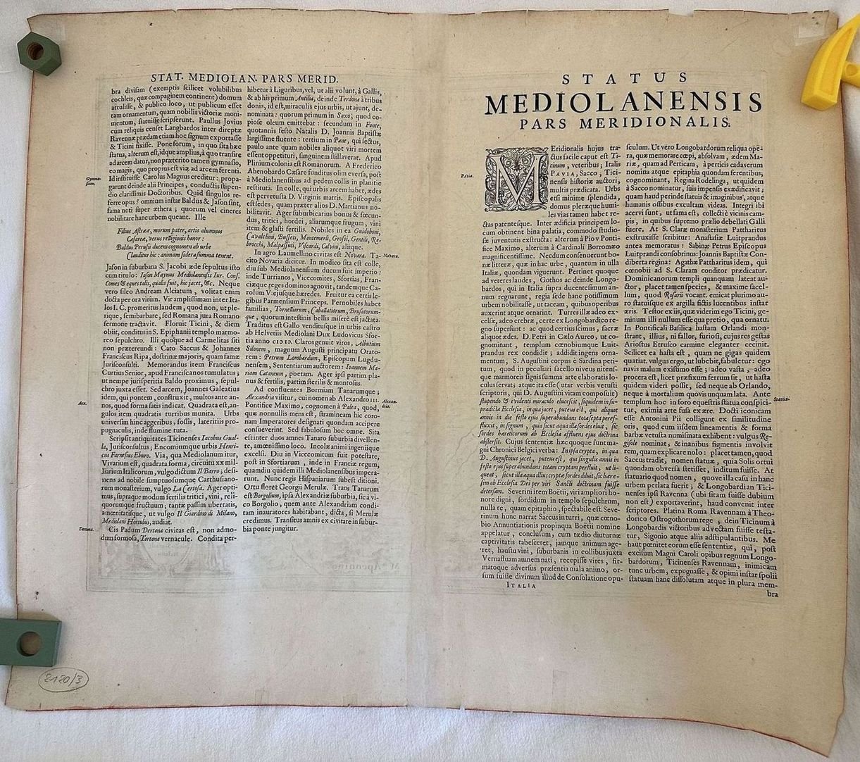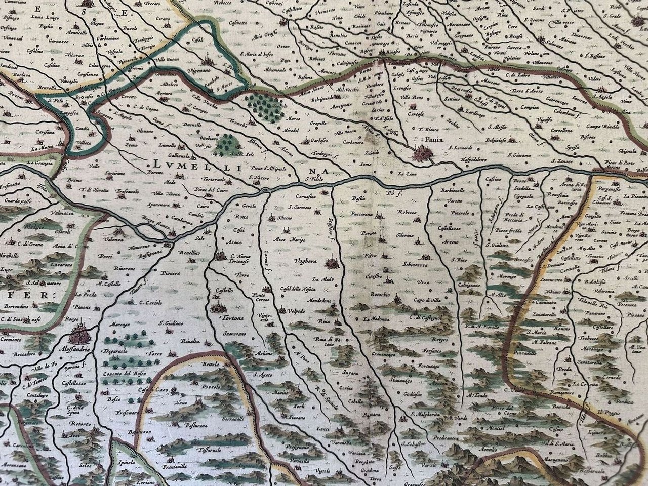 Carta geografica colorata a mano impressa ad Amsterdam da Johannes Janssonius (1588-1664) inserita nell'opera "Novus Atlas sive Theatrum Orbis Terrarum", edizione latina seicentesca. La mappa mostra lil territorio di Pavia con le città di Lodi, Tortona e Alessandria. Le città più grandi sono illustrate con castelli in miniatura, numerose i paesi più piccoli e le foreste. In basso a destra elegante cartiglio che mostra una Regina circondata da numerosi animali selvatici come cervi, daini, un coniglio e una volpe. Al verso testo in latino che descrive il Territorio di Milano. Cartiglio centrale con legenda dei luoghi più importanti. In buone condizioni. AUTORE: Johannes Janssonius (1588-1664) ATLANTE: Novus Atlas sive Theatrum Orbis Terrarum DATA: XVII secolo TECNICA: Acquaforte su rame colorata a mano DIMENSIONI DEL FOGLIO: cm 58X48,8 DIMENSIONI INCISIONE: cm 49x37,5 CONDIZIONI: Buone condizioni. Alcune usure e strappi marginali. Geographical map coloured by hand published in Amsterdam by Johannes Janssonius (1588-1664) in the work "Novus Atlas sive Theatrum Orbis Terrarum", latin edition of 17th century. The map shows the land of Pavia with the cities of Lodi, Tortona and Alessandria. The biggest cities have been ilustrated with castles in miniature, different little villages are depicted and mountains. In the lower right corner a cartouche showing a Queen surrounded by different forest animals as deers a rabbit and a fox. Text in latin language and description of the land of Milan in the verso. In good conditions. AUTHOR Johannes Janssonius (1588-1664) ATLAS: Novus Atlas sive Theatrum Orbis Terrarum DATA: XVII secolo TECHNIQUE: Copper etching coloured by hand PAGE SIZE: cm 58X48,8 PRINT'S SIZE: cm 49x37,5 CONDITIONS: Good conditions. Some wearings and tears in the edges