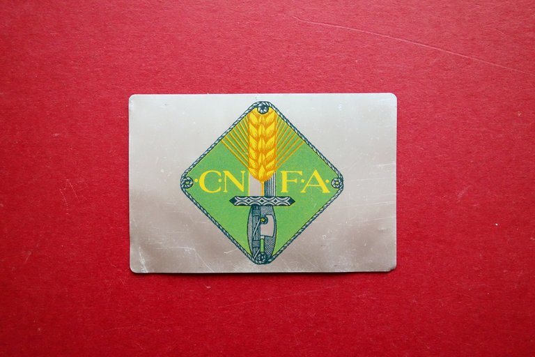 Tessera in alluminio, Confederazione Nazionale Fascista degli Agricoltori tessera in alluminio compilata 1927 con grafica a colori D. Capponi - Bologna, 1927; tessera originale in alluminio, con bella grafica d'epoca a colori; al retro sezioni bianche compilate manualmente. Cm 5x7,5. Condizioni di conservazione Buone condizioni con tracce d'uso, minimi leggerissimi graffietti, lievi ammaccature agli angoli inferiori. Per ulteriori dettagli vedi foto. Particolare, in alluminio. Grafica a colori. SC03.D18613 N