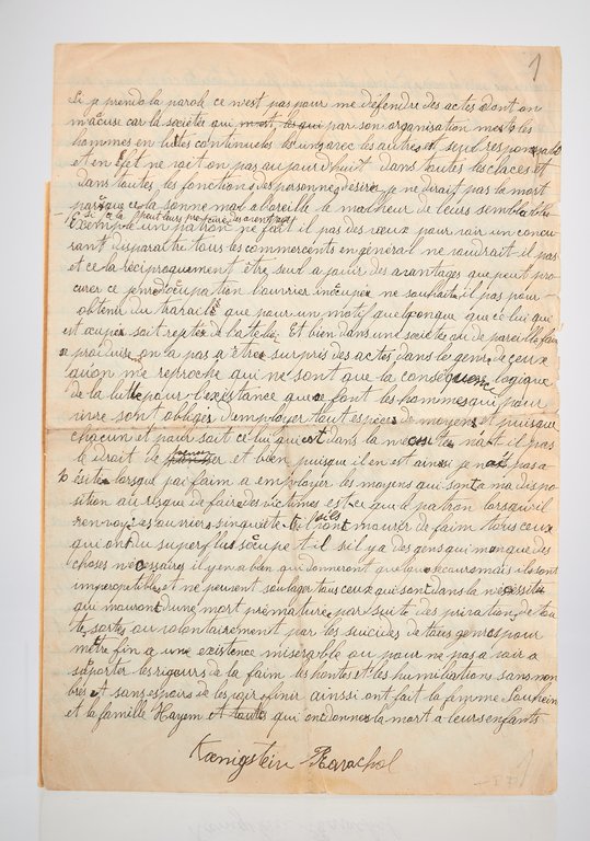 1892 | 20 x 29.50 cm | 4 pages sur un double feuillet | Exceptional complete autograph manuscript of Ravachol’s true last testament — largely unpublished — unknown in this form, preceding its rewriting by a third party for publication in the press. A unique testimony to the genuine thought of the anarchist icon.   Four-page lined quarto manuscript, entirely written in black ink and signed twice “Konigstein Ravachol” at the foot of each sheet. Pencil corrections within the text, possibly in the hand of his lawyer. Some horizontal folds and very minor marginal tears, without loss. Written in his prison cell during the second Montbrison trial that led to his death sentence, this text, hastily penned, without punctuation or capital letters, and in naïve spelling, was meant to be delivered orally by Ravachol during the hearing.   “Ravachol was dead set on putting in his two cents for the defence, not to defend himself, but to explain. No luck, dammit! Four words in and the judge cut him off. His statement isn’t lost, by Jove!” (Émile Pouget, in Père Peinard, July 3–10, 1892). This self-styled Rocambole of anarchism was not allowed to read his statement aloud, but he handed it to his lawyer Maître Lagasse, and by June 23 the forbidden text appeared in the conservative newspaper Le Temps. This first publication was so faithful to the original that it preserved the author's eccentric spelling — a fidelity that Émile Pouget would ironically criticise in the Père Peinard issue of July 3, 1892, one week before Ravachol’s execution: “Le Temps, that opportunist bedsheet, printed it as is. Like a true Jesuit, it even printed it too true. Ravachol had written the thing for himself; he knew how to read it — but there wasn’t a word of correct spelling, seeing as he knew about spelling as much as he knew about cabbage farming. Le Temps printed the thing without changing a line, so it’s practically unreadable [.]. That’s exactly what the bastards wanted, dammit! [.] I’m reprinting it below, without changing a word, just fixing the spelling.”   That same July 3 issue of Père Peinard included a corrected version — orthographically — of the statement initially published in Le Temps. This dual publication, combined with Ravachol’s defiant bearing before the guillotine, had a powerful effect on public opinion. Until then, even anarchist publications had kept a certain distance from this provocative criminal, suspected of using the anarchist cause for personal gain. But following his execution, the testament was quickly reproduced in other newspapers, and Ravachol’s final cry of revolt soon became a genuine anarchist anthem among libertarians worldwide. However, the version circulated in the press — the only known version until now, the original manuscript having disappeared — differs markedly from the manuscript in our possession. Indeed, the style was lightly polished, several turns of phrase refined, and, most significantly, entire passages were excised, including the conclusion paragraph, which was fully replaced.   Our manuscript, with its crossings-out and revisions, is likely the original version of this political testament. Written in a single burst, in dense handwriting, without punctuation or paragraph breaks, it includes two lengthy sections expressing concerns for public health that are entirely absent from the published version. The first is a third of a page-long passage about the “dangerous ingredients” added to bread: “no longer needing money to live, there’d be no fear of bakers adding dangerous ingredients to bread to make it look better or heavier, since it wouldn’t profit them, and they’d have, like everyone else and by the same means, access to what they needed for their work and existence. There’d be no need to check whether the bread weighs right, if the money is counterfeit, or if the bill is correct.” The second, nearly a full page long, concerns the silk-dyeing industry in which Ravachol had worked: “If one reflects atten