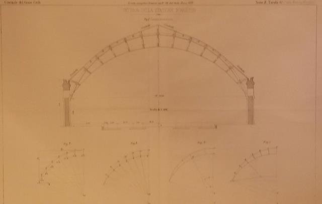Quattro incisioni in formato cm.66,2x88 (la prima) e cm.39,7x54,5 (le altre tre), con figure. Serie B, tavole n°38, 41, 42, 43 (le ultime tre fanno parte della "Memoria Marchesi"). Le carte raffigurano il Metodo dei movimenti statici nella determinazione degli sforzi che si esercitano nella varie parti della Centina della tettoia e la Sezione trasversale. le quattro tavole. Codice libreria 43072.