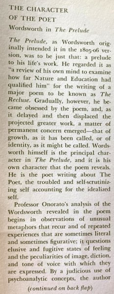 Con un uso giudizioso dei concetti psicoanalitici, Richard Onorato interpreta il Wordsworth rivelato nel poema The Prelude e mette in relazione i problemi dell'autobiografia poetica con quelli della personalità.