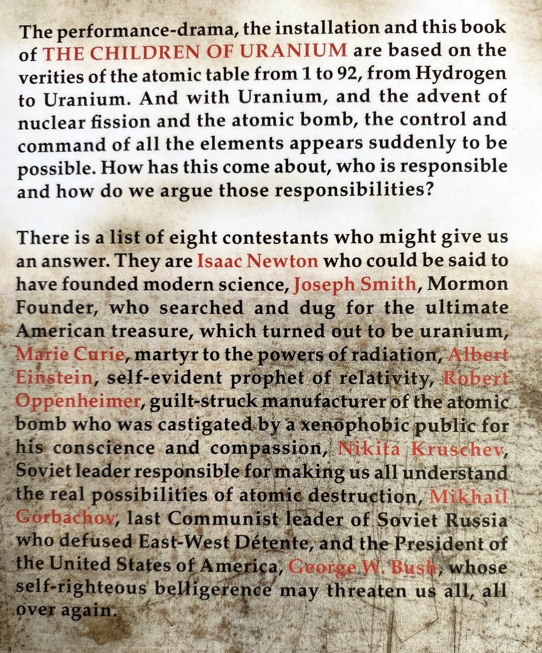 La performance teatrale, l'installazione e il libro dei Figli dell'Uranio si basano sulla tavola atomica da 1 a 92, dall'Idrogeno all'Uranio. E con l'uranio, l'avvento della fissione nucleare e della bomba atomica, il controllo e il comando di tutti gli elementi appare improvvisamente possibile. Come è accaduto, chi è responsabile e come possiamo discutere di queste responsabilità? C'è una lista di otto personaggi che potrebbero darci una risposta: Isaac Newton, Joseph Smith, Marie Curie, Albert Einstein, Robert Oppenheimer, Nikita Kruschev, Mikhail Gorbachev, ultimo leader della Russia sovietica fautore della distensione Est-Ovest, e il presidente degli USA, George W. Bush, la cui propensione alle armi potrebbe minacciarci tutti. Il volume è collegato alla mostra omonima (Napoli, PAN, 31 marzo-1 maggio 2006).