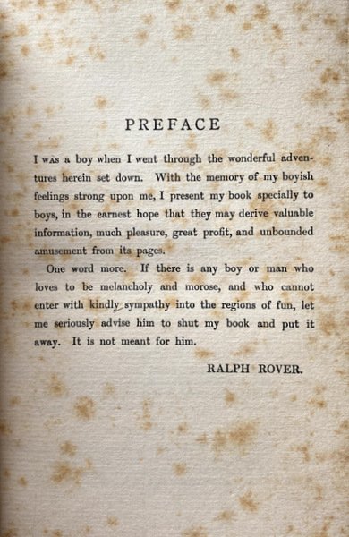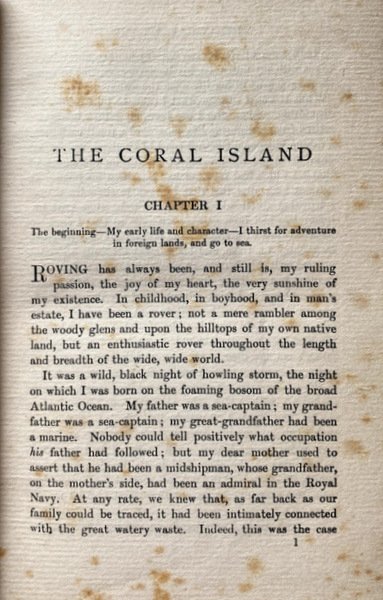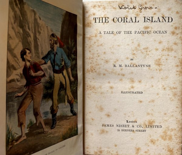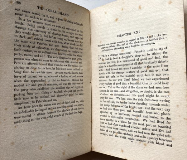 Soggetti: Survival, Juvenile fiction, Shipwrecks, Islands, Naufragi, Narrativa per ragazzi e bambini, Isole, Pirates, Oceania, Missionaries, Missionari, Pirati, Sopravvivenza, Pacific Ocean, Defoe, Robinson Crusoe, Golding, Lord of the Flies, L'isola di corallo, Libri Antichi da collezione, Libri Vintage fuori catalogo, Prime edizioni, Libri rari, Collezionismo, Narrativa, Avventura, Robert Louis Stevenson, Romanzi d'azione, Ottocento, Novecento, Scrittori scozzesi, Autori britannici del XIX secolo, Robinsonade, Romanzi distopici, Fantasy, Pirateria, Cannibalismo, Schooner, Vascelli, Christianity, Adventure stories for young folks, British imperialism, Impero britannico, Victorian theme, Cultura Vittoriana, Evangelizzazione, Missionari cristiani, Colonialismo, Razzismo, Novels set on uninhabited islands, Survival skills, 1850s Children's books, Treasure Island, Nautical fiction, Libri in inglese, Castaways in fiction, Signore delle mosche, Darwinismo, Polinesia, Arrow, Conversione, Legno di sandalo, Bastimenti, Navi, Viaggio, Europei, Civilizzazione, Relazioni coloniali nel periodo vittoriano, Imperialismo, Gerarchie sociali, Superiorità occidentale, London Missionary Society, Educazione, Morale, Pedagogia, Classic for English primary school children in the early 20th century, Ralph, Jack, Peterkin, Cast ashore, Storms, Tempeste, Bloody Bill, Barriera corallina, Ex-libris, Matt. B. Hewerdine, Islands, Oceania, Collectible Old Books, Out of Print Books, First Editions, Rare Books, Collectibles, Fiction, Adventure, Action Novels, Nineteenth and Twentieth Century, Scottish Writers, British 19th Century Authors, Dystopian Novels, Piracy, Cannibalism, Vessels, Evangelization, Christian missionaries, Colonialism, Racism, English books, Polynesia, Conversion, Sandalwood, Ships, Travel, Europeans, Civilization, Victorian colonial relations, Imperialism, Social hierarchies, Western superiority, Education, Morals, Pedagogy, Coral reef, Journey, Favole