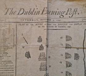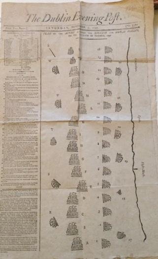 The Dublin Evening Post. Saturday, November 4, 1797. In folio (cm. 52,5); pagine 4. Distinta relazione della battaglia di Camperdown, battaglia navale, combattuta al largo della costa nord dell' Olanda che culminò nella vittoria della Royal Navy sulle forze navali della Repubblica Batava nel corso delle guerre rivoluzionarie francesi. La flotta britannica al comando dell’Ammiraglio Adam Duncan sconfisse la flotta olandese, al comando dell'ammiraglio Jan Willem de Winter, al largo della costa del villaggio di Camperduin, a Nord-Ovest di Alkamaar. L'ammiraglio de Winter venne fatto prigioniero con la sua nave, disalberata e con metà equipaggio morto o ferito. Nell'arrendersi egli fece per consegnare la sua spada a Duncan, ma questi rifiutò e gli strinse la mano. Axs