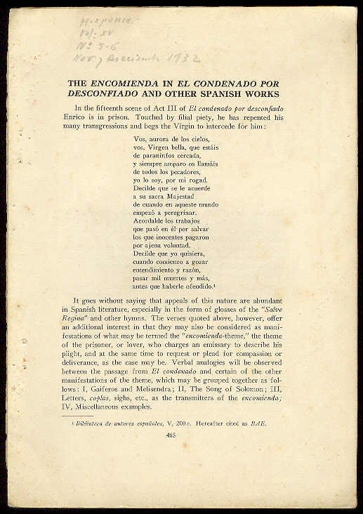 [S.l., U.S.A.?]: Rev. Hispánia, [1932].- P. 465-482 (en total 18 p.); 4ª (24 cm); Texto en inglés; Cubiertas provisionales.- (Desglosado de la "Rev Hispania", Vol. XV, Nº5-6, Noviembre y Diciembre, 1932).* Al tratarse de un desglose carece de cubiertas y se le han puesto unas provisionales en papel. TEATRO ESPAÑOL DESDE SUS ORÍGENES HASTA EL SIGLO XVIII