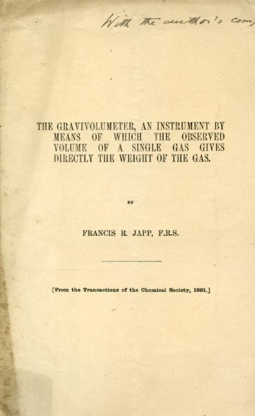 The gravivolumeter, an instrument by means of which the observed volume of a single gas gives directly the weight of the gas (From this Transactions of the Chemical Society, 1891) | Libros antiguos y modernos | Japp Francis Robert