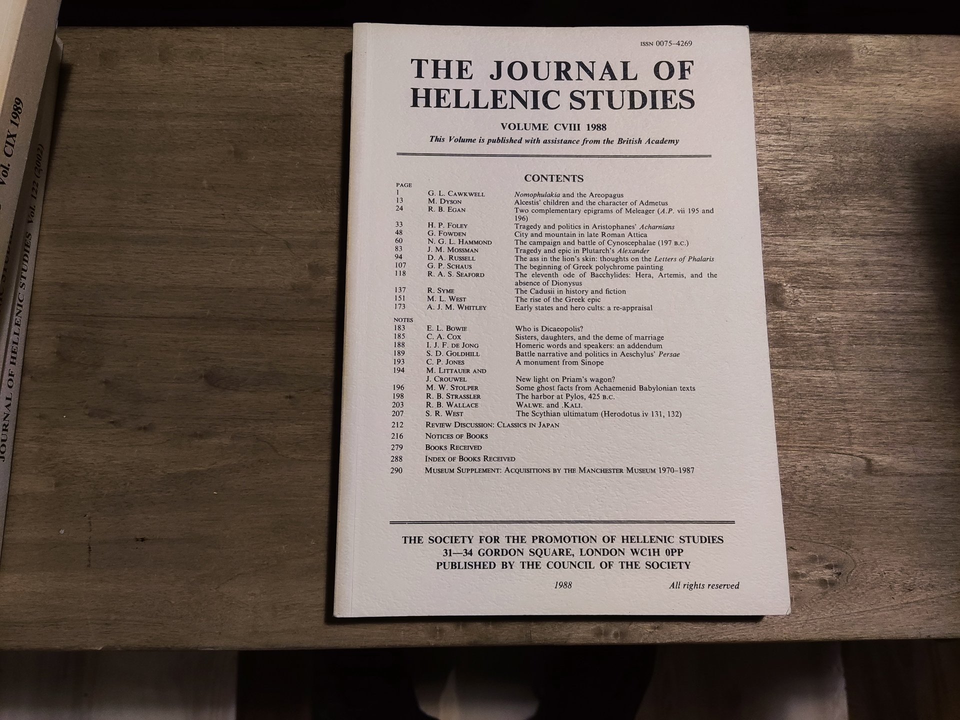 The Journal of Hellenic Studies Volume CVIII Society for the Promotion of Hellenic Studies - 1988 Volume in ottime condizioni, minimi segni del tempo. Non esitate a contattarci per altre foto o richieste. Saremo lieti di soddisfare ogni vostra esigenza.