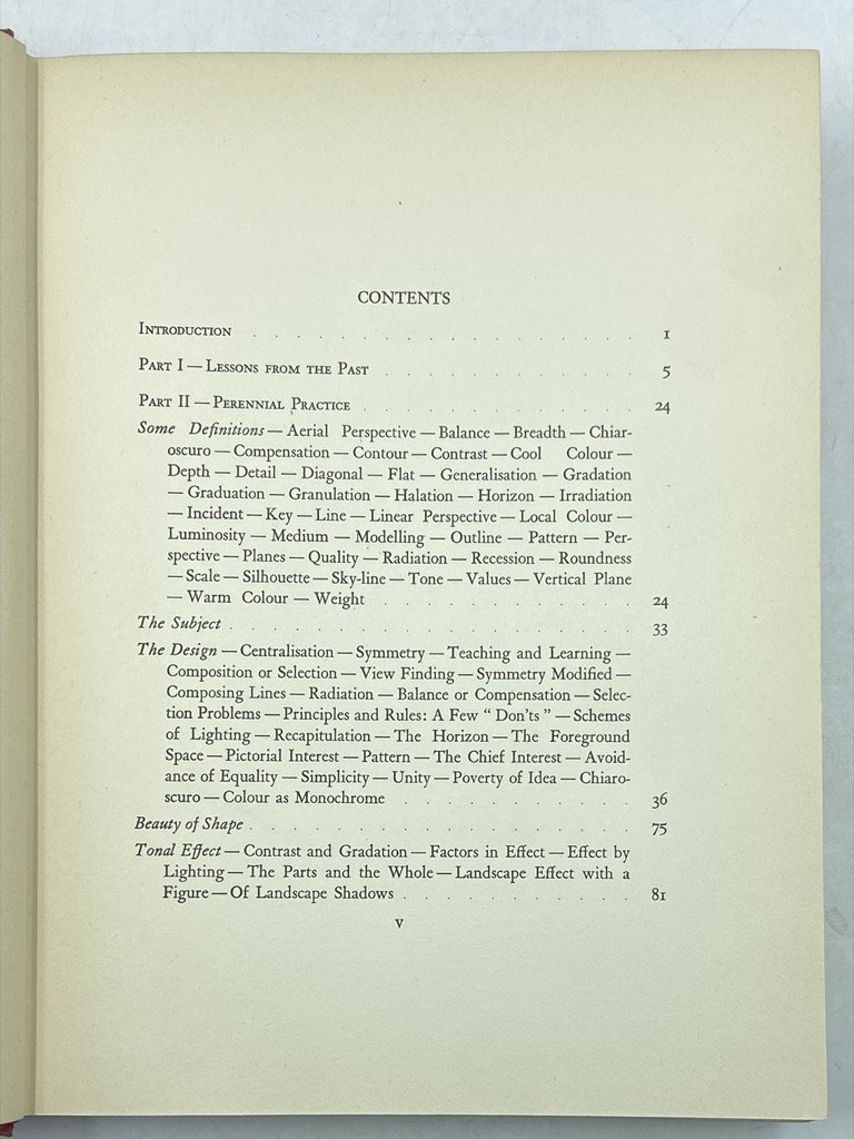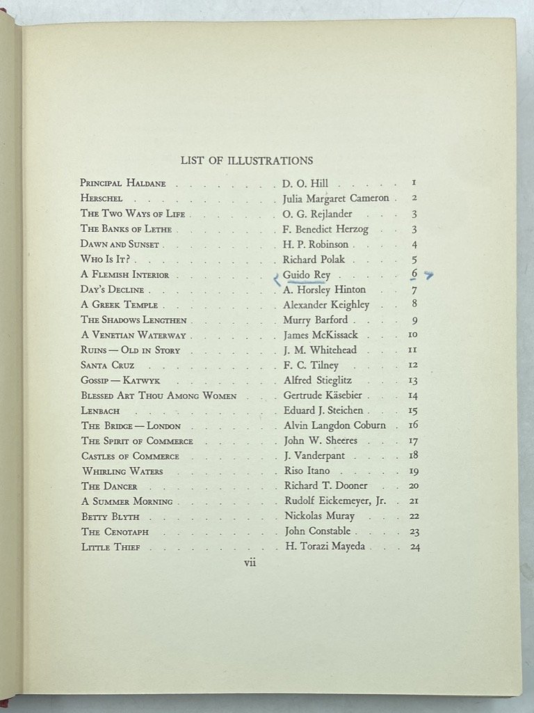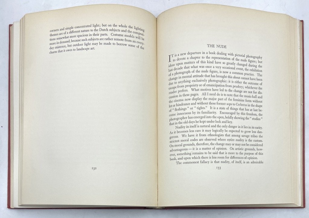 Legatura editoriale in tela (manca la sovraccoperta), cm 26 x 19.5, pp XII 218 (2), 80 tavole fotografiche in nero su carta patinata e alcune illustrazioni al tratto nel testo. In inglese. Buon esemplare, seppur privo di sovraccoperta, con minimi segni d'uso sulla cuffia superiore e un piccolo segno a matita blu sull'elenco delle tavole, ma complessivamente ben conservato. Testo programmatico divulgativo che illustra, all'apice della diffusione internazionale del movimento, tecniche e modelli del pittorialismo con esempi di artisti europei, americani e giapponesi. L'autore, pittore e illustratore, esprime in perfetta sintesi l'estetica del pittorialismo, affermando senza mezzi termini il valore artistico del mezzo fotografico se piegato ai codici della pittura e della grafica: «I am certain that pictorial photography may be practised as a branch of the fine Arts, in spite of all that is said to the contrary by art-critics, who for the most part as neither painters nor photographers. As a life-long painter, I assert this opinion with perfect conviction. Photography in the hands of pictorial workers is a medium of response to stimuli exactly as painting is. It fosters the same ambitions, and is actuated by the same kind of inspiration. (.) design and tone . composition and chiaroscuro are essential in each case; and the thousand other little qualities and concerns that appear during the making of a print are germane to those of the monocrome worker in the graphic arts». La notevole lista dei fotografi che contribuirono all'opera offre un efficace panorama della fotografia dell'epoca, dominata dalla tendenza pittorialista: oltre alle proprie immagini Tilney raccoglie e commenta fotografie di Alfred Stieglitz, Eduard Steichen e altri, spesso confrontandole con dipinti. Per l'Italia figura il celebre alpinista Guido Rey, uno dei maggiori esponenti della scuola pittorialista nazionale, con la celebre fotografia dell'interno fiammingo (1908). Il nostro esemplare è arricchito dalla presenza di una lettera dell'editore che invia il volume a Guido Rey e lo ringrazia per l'utilizzo della fotografia (segnata poi in matita blu sull'indice).