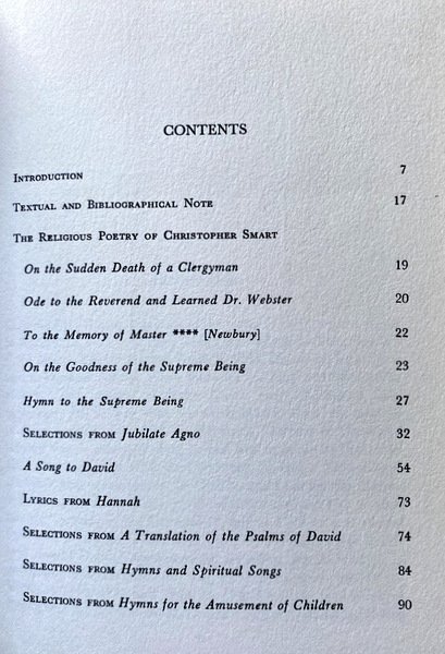 Soggetti: British Poetry, Drama, Criticism, Interpretation, Cultural Studies, English Literature, 18th Century, Christianity, Religious Poetry, 1763-1771, Poetical Works, On the Power of the Supreme Being, To Miss H with Some Music, Christ, Christian Church, Hymns, Jesus, A song to David, Jubilate Agno, Biographies, Vintage Out of print Books, Collectibles, Collectionism, Bibliography, Notes, Supreme Being, Theology, Hannah, Lyrics, Spiritual Songs, Amusement of Children, Sudden Death of a Clergyman, Seatonian Prize poems, Anglican poets, God, The memory of Master, Goodness, Divine revelation, Ode to the Reverende Dr. Webster, Prayers, Sunday, Saturday, For I will consider my Cat, Jeoffrey, Hilliade, The Hilliad, John Wesley, William Bowling, Newtonian empiricism, Ark of Salvation, Science, Jeoffry, Mental asylum, Biblical David plays, Psalm, Libri in inglese, Settecento, Una canzone per Davide, Poeti britannici, Poesia britannica, Dramma, Critica, Interpretazione, Studi culturali, Letteratura inglese, XVIII secolo, Cristianesimo, Poesia religiosa, Opere poetiche, Sul potere dell'Essere supremo, Cristo, Chiesa cristiana, Inni, Gesù, Biografie, Libri fuori catalogo, Collezionismo, Collezionismo, Bibliografia, Appunti, Essere supremo, Teologia, Testi, Canzoni spirituali, Divertimento dei bambini, Morte improvvisa di un sacerdote, Antologie poetiche, Raccolte, Poesie, Poeti anglicani, Dio, Bontà, Rivelazione divina, Preghiere, Domenica, Sabato, Empirismo newtoniano, Arca della salvezza, Scienza, Testi biblici, Salmi