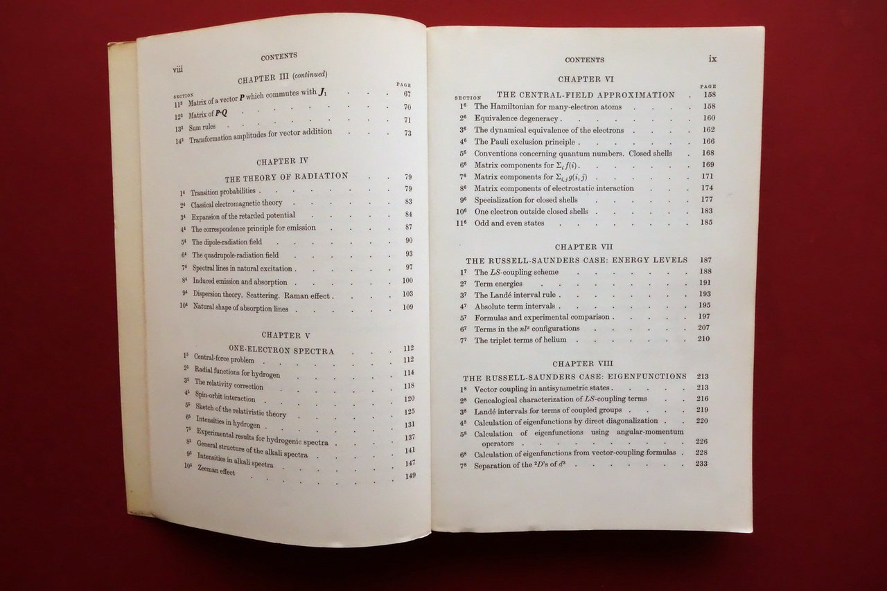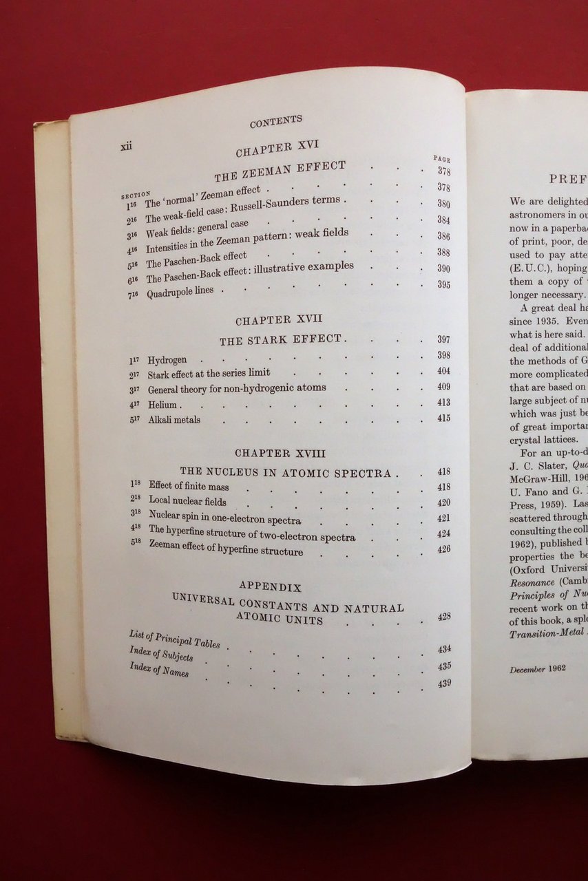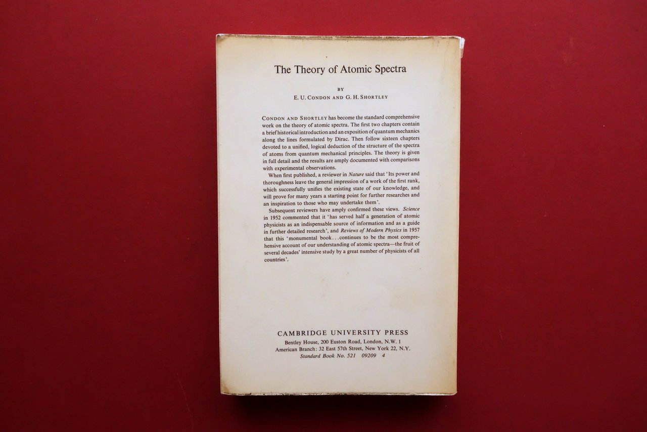 E. U. Condon & G. H. Shortley, The Theory of Atomic Spectra Cambridge University Press, 1977; cm 23,5x15,5; pp. XVI-442; brossura ed. Al frontespizio nome del precedente proprietario annotato a penna. Edizione in lingua inglese. Condizioni di conservazione Buone condizioni con tracce d'uso; brossura con lievi accenni di ingiallimento, leggermente sgualcita ai margini e agli angoli; cuffia superiore con un piccolo taglietto. Interni molto ben conservati. SETT197.L27335 N