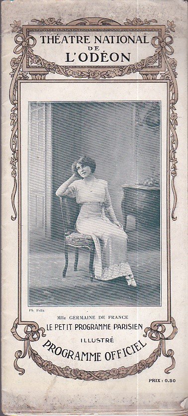In-8°, pp. 24 nn., brossura editoriale illustrata con ritratto fotografico di Germaine de France. Illustrazioni fotografiche n.t. con ritratti di attori ed attrici celebri del teatro francese del tempo. Pubblicità figurate. Buon esemplare. Elegante programma teatrale; è presente, ripiegato, il programma completo degli interpreti di un'Histoire de Manon Lescaut' di Didier Gold rappresentata all'Odéon.
