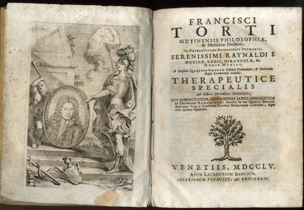 >in-8 grande (mm 235 x 177) pp. XXXXVIII, 496, con una grande tavola incisa che illustra l'albero delle "febbri" ed un bell'antiporta con il ritratto del Torti. Legatura coeva in piena pergamena, titolo in oro al dorso. E' questa la più celebre tra le opere del modenese Francesco Torti, dove classificò le febbri e individuando, per quelle malariche maggiormente perniciose, il dosaggio maggiormente elevato di chinino rispetto al consueto. Grazie alla Terapeutica ha ricevette importanti riconoscimenti, fra i quali la nomina a socio della Royal Society nel 1717, all'epoca presieduta da Isaac Newton. Bruniture diffuse a tutto il volume. Nell'insieme ottimo.