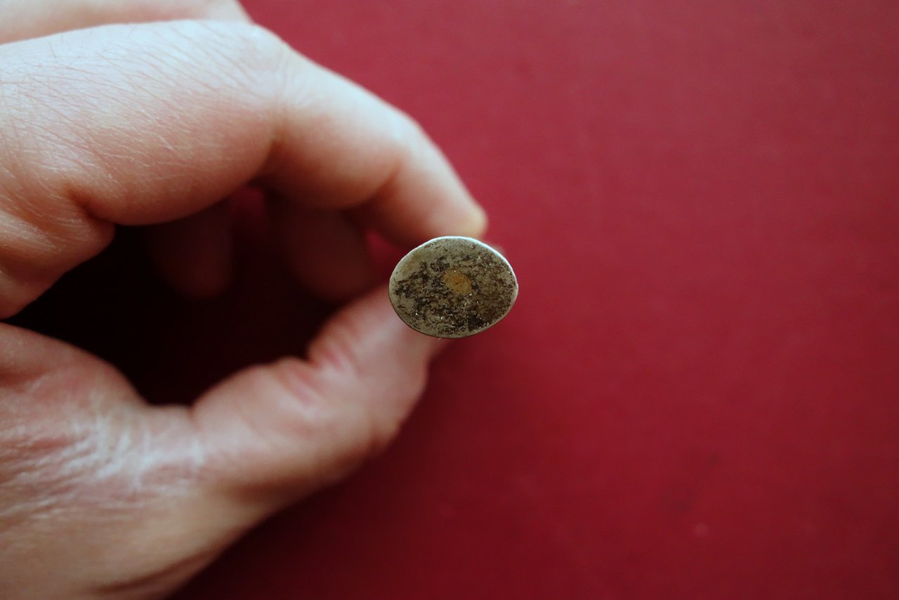 Timbro in argento, Timbro in argento punzonato libero (non inciso) Anni '30 del Novecento circa; piccolo timbro in argento con scanalature e decorazioni incise ai lati; punzonato 800. Base ovale non incisa. Dimensioni: cm circa 6x1,5. Condizioni di conservazione Buone condizioni con tracce d'uso e leggeri segni del tempo, metallo leggermente scurito. Per ulteriori dettagli vedi foto. SC04.D0547 N