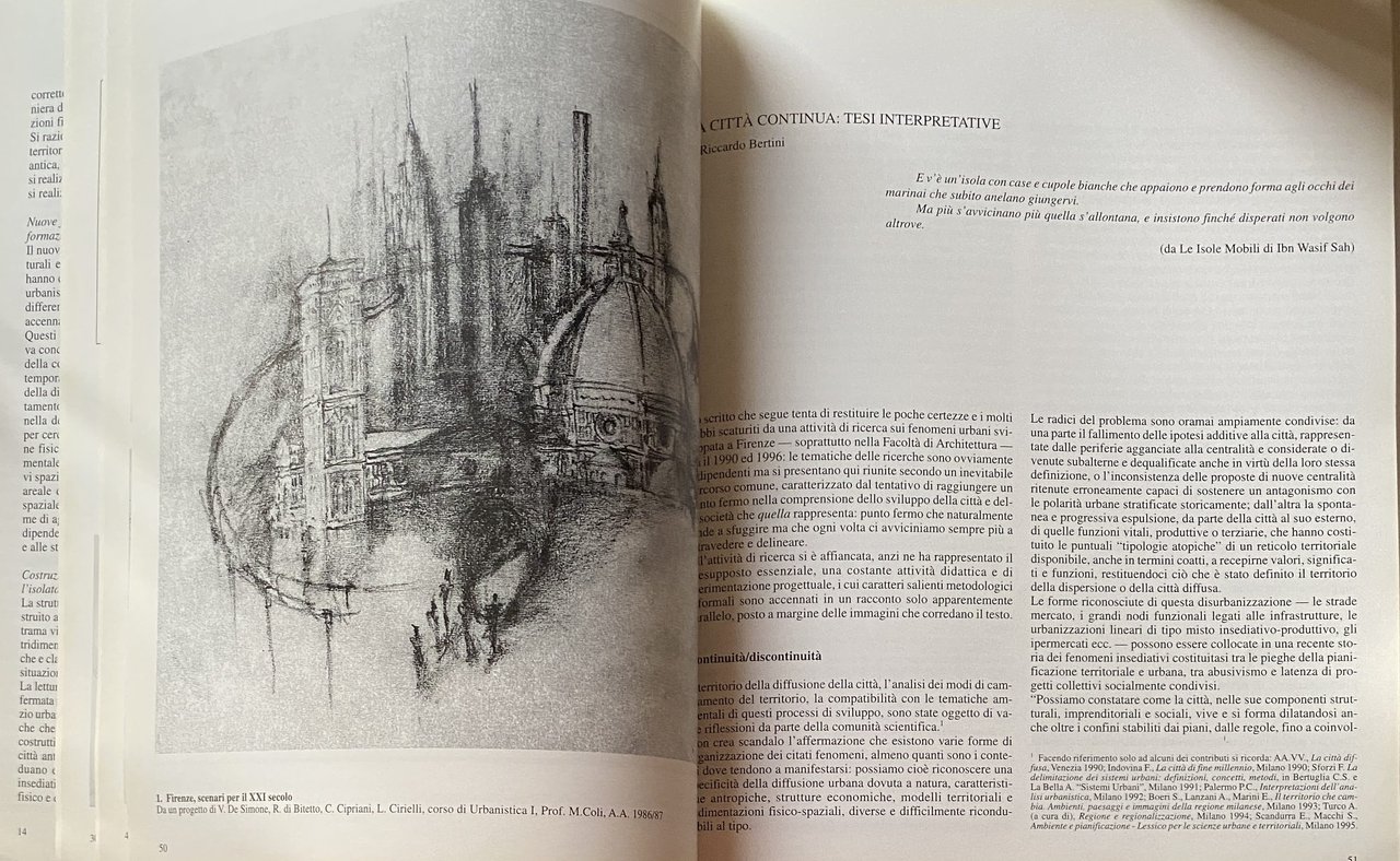 Qualsiasi ipotesi o interpretazione noi possiamo produrre, la città è sempre da un'altra parte, il suo centro segreto ci appare d'improvviso legato ad una strada che in qualche modo riusciamo ad intravedere, ma che non abbiamo ancora percorso. Non possiamo dunque lasciare che l'idea di città ben delimitata e identificabile che finora ha permeato la nostra cultura e indirizzato la nostra conoscenza, si frapponga alla possibilità di comprendere i nuovi sviluppi e le rapide trasformazioni che stanno repentinamente operando sul fenomeno urbano.