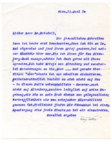 Small 4to. 1 p. To Egon Friedell: "Ihr freundliches Schreiben kann ich erst heute beantworten, denn ich bin am 10. Mai abgereist und fand Ihren Brief gestern, bei meiner Rückkehr hier vor. Ehe ich Ihnen für das Altenberg-Buch zusage, möchte ich doch gerne mit Ihnen sprechen. Ich habe Briefe von Altenberg und mancherlei Erinnerungen an ihn. Aber . Und gerade über dieses 'aber' könnte ich nur mündlich diskutieren. Selbstverständlich bezieht es sich nicht auf das - in diesem Falle nebensächliche - Honorar, auch nicht auf Altenberg, sondern lediglich auf seine Umgebung, die bis an sein Grab ebenso von gelegentlicher Vortrefflichkeit wie von mehrfacher Miserabilität gewesen ist [.]".
