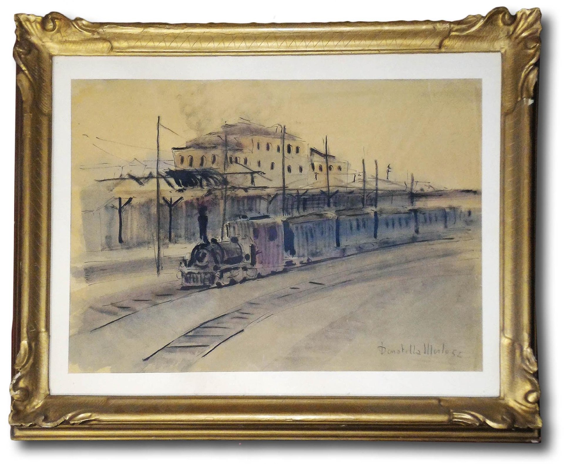 >Dipinto (cm 42x30), entro cornice scolpita e dorata. Deliziosa veduta all'acquerello della Stazione di Porta Susa in Torino, con lungo treno viaggiante in primo piano. Firmato ''Donatella Merlo 1952''. In quell'anno l'autrice partecipò alla 109° Esposizione Sociale a Palazzo Chiablese di Torino. Quotata pittrice torinese, nata nel 1927, discendente di un'illustre famiglia di artisti. La sua formazione avviene sia in studio con il nonno, il padre, con Omegna e Morbelli, sia all'Accademia Albertina, dove segue in particolare gli insegnamenti di Casorati, che indurranno l'artista ad una profonda trasformazione del rapporto con l'Arte figurativa. Frequenta fin da giovanissima l'ambiente di Albisola, all'epoca delle sperimentazioni di vari artisti fra i quali Fontana e Cherchi. Svolge un'intensa attività espositiva in Italia e all'Estero. In perfetto stato di conservazione.