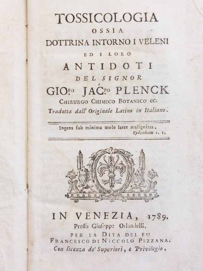 In-12° (cm. 18), legatura coeva in cartonato d'attesa alla rustica (impercettibili integrazioni); pp. 430 [2b] in barbe, in buono stato (poche fioriture). Prima e non comune edizione italiana di questo noto studio sui veleni e sui loro antidoti del medico austriaco, Joseph Jakob Ritter Plenck, pioniere della moderna dermatologia, ma anche grande studioso delle piante e dei relativi usi medici. Il lavoro descrive meticolosamente tutte le sostanze tossiche del mondo animale, vegetale e minerale, il potere nocivo, il suo antidoto e il possibile utilizzo in farmacia. Tratta poi i veleni in vapori e gli animali velenosi. Cfr. Garrison 378. Esemplare molto buono. (NK3)