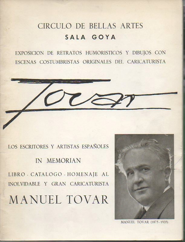 TOVAR. EXPOSICION DE RETRATOS HUMORISTICOS Y DIBUJOS CON ESCENAS COSTUMBRISTAS ORIGINALES DEL CARICATURISTA. LOS ESCRITORES Y ARTISTAS ESPAÑOLES IN MEMORIAN. LIBRO, CATALOGO, HOMENAJE AL INOLVIDABLE Y GRAN CARICATURISTA MANUEL TOVAR.