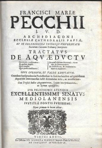 prima ediz., in 4°(cm 33x21), pp. 1° vol.: 2 b., 40 nn., 412, 62 nn.; 2° vol.: 40 nn., 466, lxxvj; 3° vol.: 32 nn., 291, 1 b., 68 nn.; 4° vol. 12 nn., lxxix, 1 b., 570, 9 nn. Ottima leg. coeva p/perg., dorsi con nervi e tit. manos. (piccoli restauri ben eseguiti), grandi marche tip. ai front., nel 1° vol. bellissimo ritratto di Bartolomeo Aresio, Reggente del Senato di Milano, a cui il volume è dedicato, opera di Blanchus su bozzetto di Cesare de Laurentys; mm. grandi testatine, capil. xilografici abitati e floreali, finalini e fregi vari. Importante e ricchissima opera sul governo delle acque pubbliche e private, tecnica idraulica, diritti e servitù agrimensurali ad esse relativi, in cui l'A. (Pavia 1620-1693, Arcidiacono della Cattedrale pavese, docente di diritto canonico e civile all'Università della sua città) ha saputo adattare l'antico diritto romano alle necessità della sua epoca e non solo, perché il suo ventennale lavoro è stato considerato insuperabile fino alla nostra epoca. Argomenti contenuti nel 1° vol.: Quomodo constituatur. Ex quibus Aquis. Quot modis. Quis possit constituere. De praescriptione decennali, vicennali, & immemorabili. De Possessorio, & Petitorio in materia Aquarum; nel 2° vol.: De Appellationibus, quae in Aquarum materia interponi possunt. De Servitute Acquaeductus in suo esse constituta. De Collaticijs, & Aquarum mensuris, cum suis Buchellis. De Rivis; nel 3° vol.: De Precario, quod in Aquarum materia frequentissime praticatur. De Servitute Aquaeductus, quomodo amittatur, vel per non usum, vel per aquisitionem, & confusionem. De Molendinis; nel 4° vol.: Centum Quaestiones Miscellaneae amplectens tractantes. Opera completa delle sue 21 tavv. in xilografia di cui molte ripiegate, e 1 tabella rip., in prima edizione e molto raramente completa nei 4 voll. e con tutte le sue illustrazioni. A very good copy. 613/34