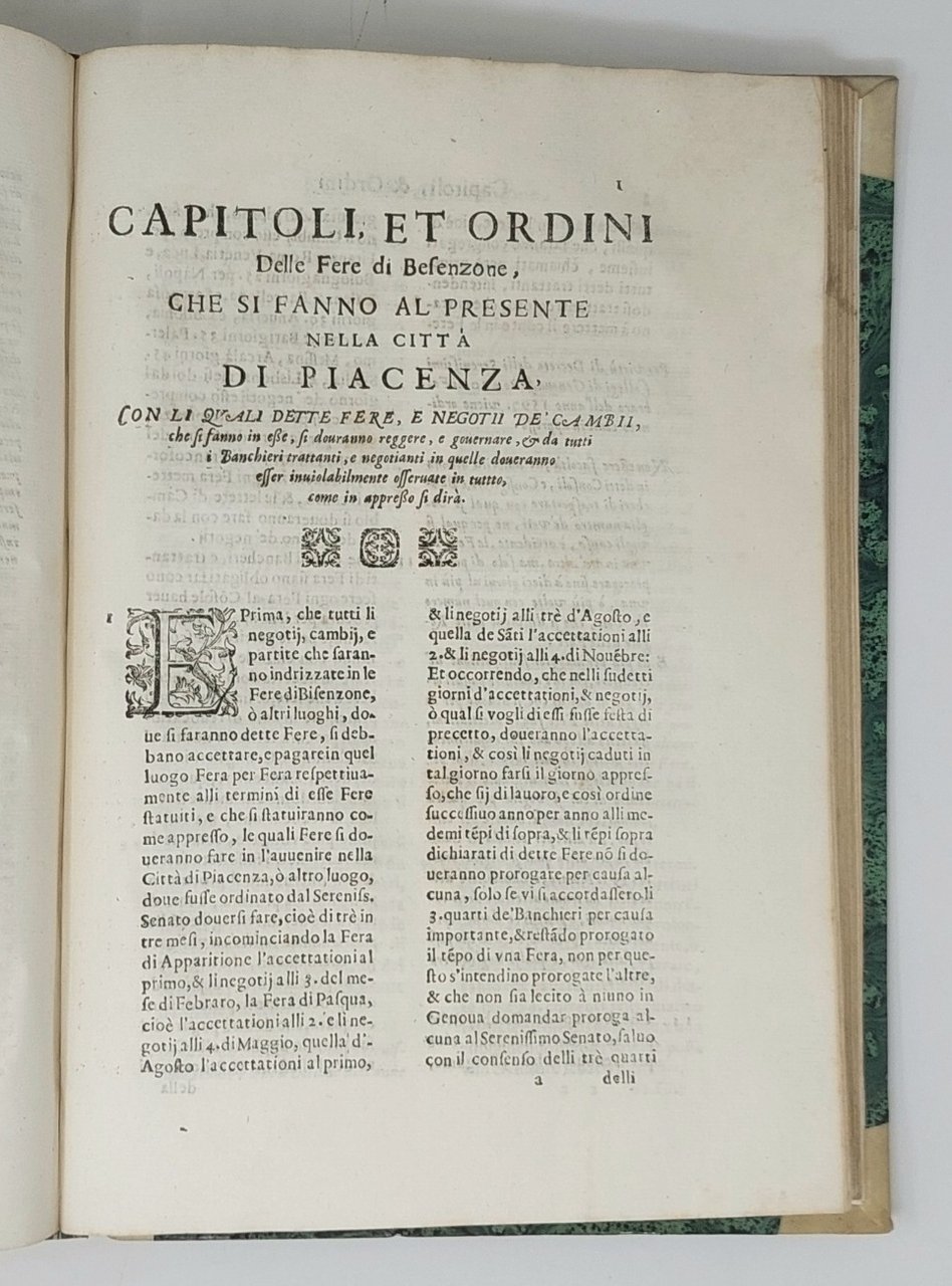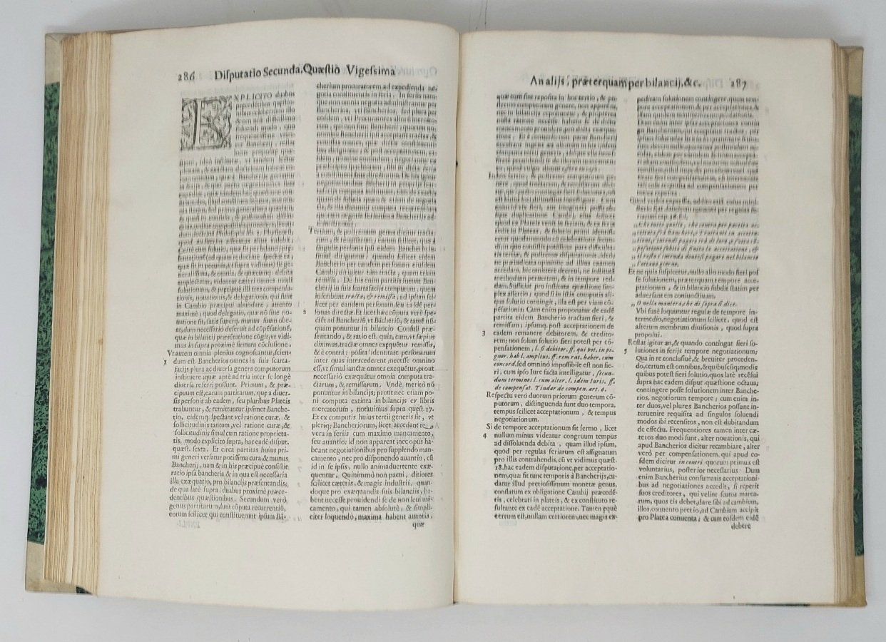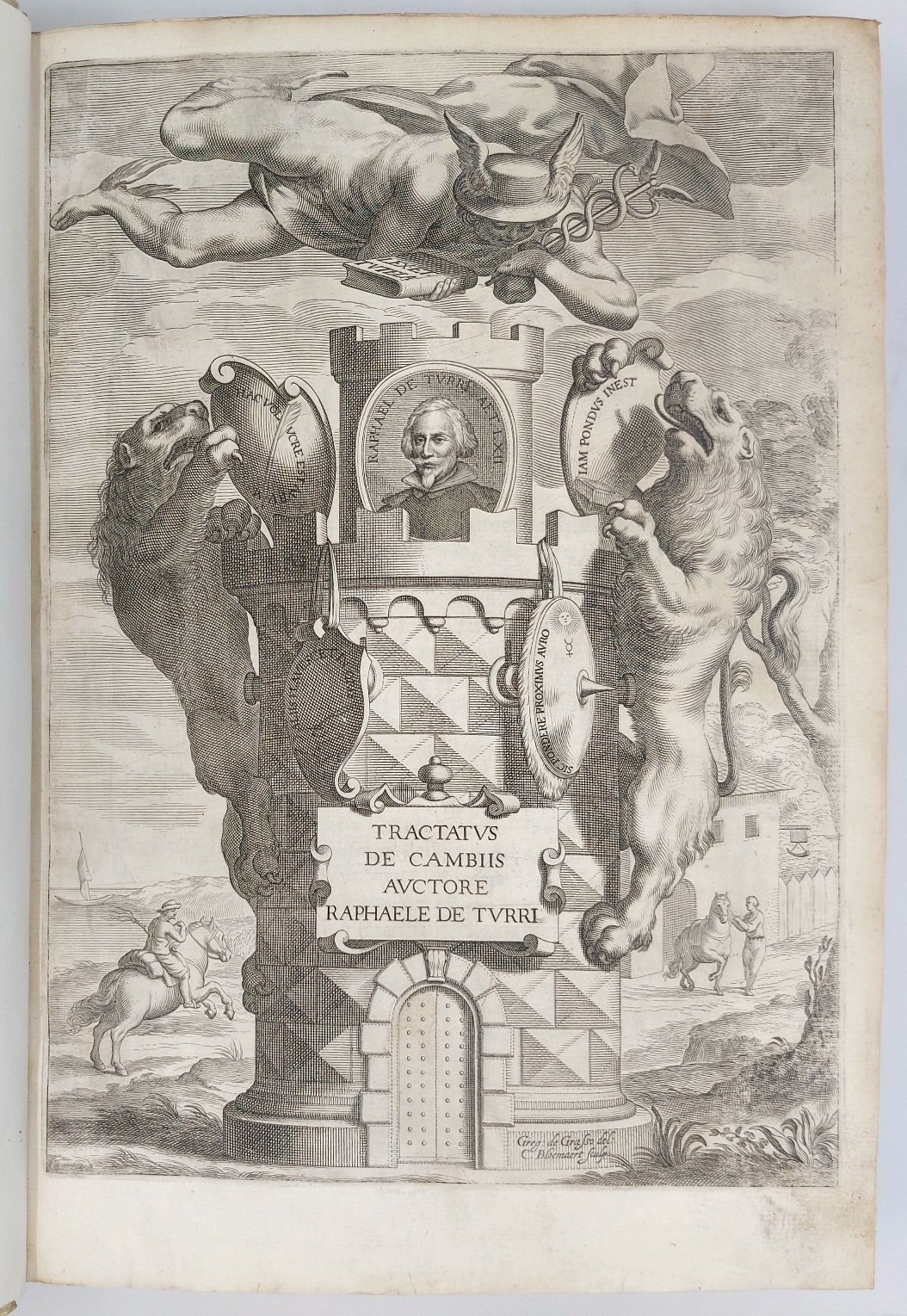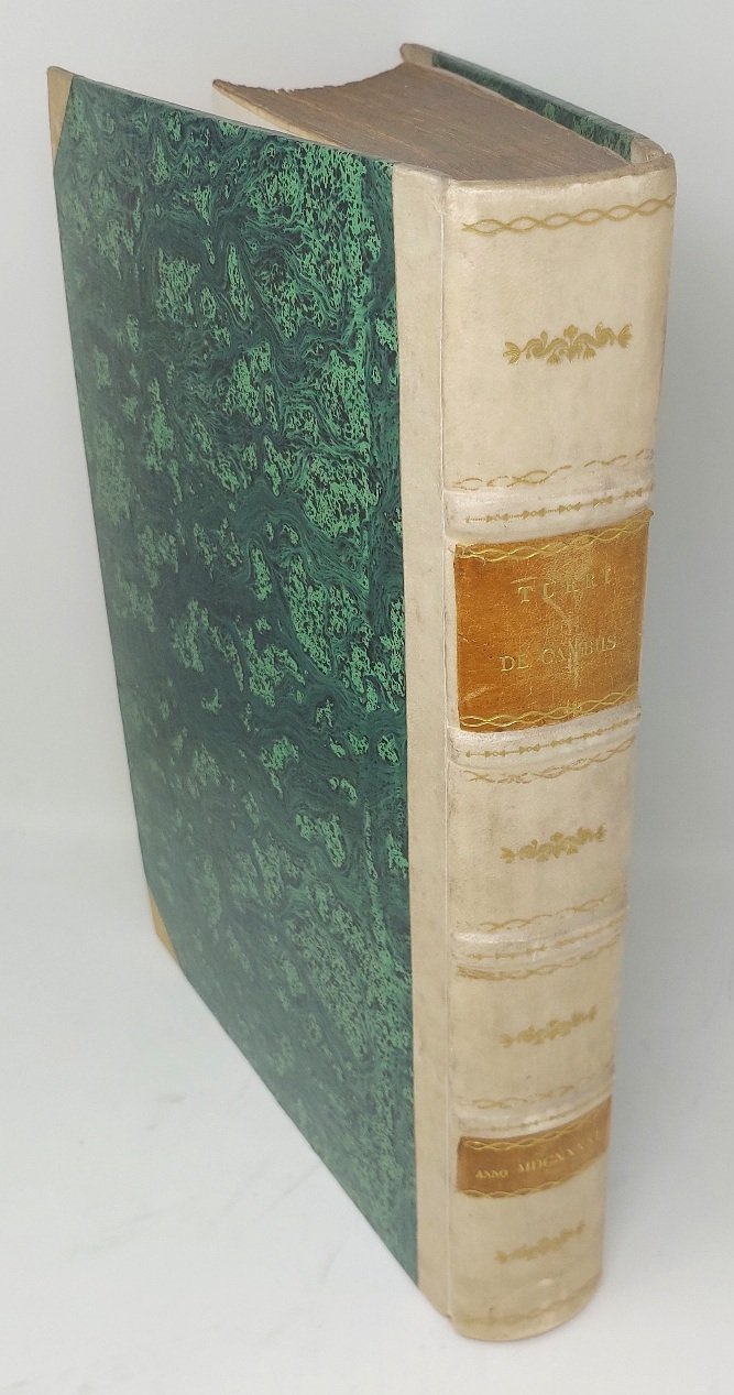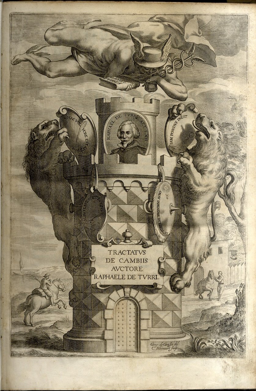 >in-folio (340 x 230 mm), pp. (4), 563, 16, ff. (54); mancano occhietto all'inizio e in fine l'Errata. Legatura ottocentesca in mezza pergamena con angoli, fregi e titolo su doppio tassello al dorso (sguardie e capitelli sostituiti). Stupendo frontespizio allegorico inciso da Cornelis Bloemaert con ritratto dell'Autore e figure allegoriche magistralmente inc. in rame da C. Bloemaert. Prima edizione di quest'opera che procurò larga fama al noto giureconsulto genovese del XVI secolo. Essa si divide in tre ''disputationes'' (a loro volta suddivise in quaestiones) nelle quali si tratta del contratto di cambio come documento probatorio di esso, del cambio con ricorsa. L'autore tratta la problematica dei cambi e delle lettere di cambio, con un notevole ricorso alla dottrina precedente, sia giuridica sia teologica, con una particolare attenzione anche alla pratica dei tribunali. A supporto molti esempi pratici, richiamando le consuetudini dei mercanti, gli statuti delle fiere, i ''Capitoli et Ordini delle fere di Besenzone; che si fanno al presente nella città di Piacenza'' (publicati nelle 16 pp. di appendice), ed in particolare molte decisioni della Rota Romana emanate tra il 1542 ed il 1633. Importante e raro. Ottimo esemplare. Manca al Cat. Einaudi. Kress Ital., 155.