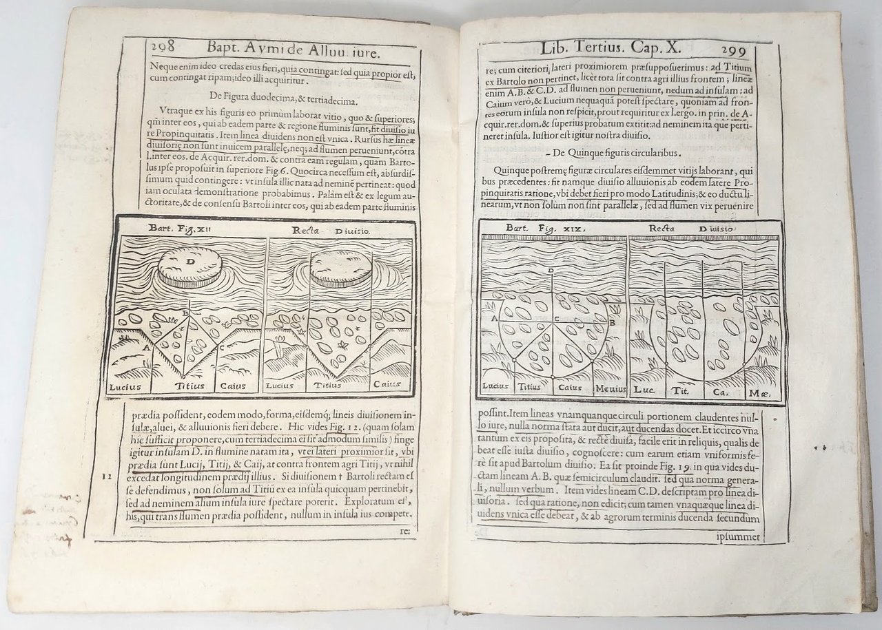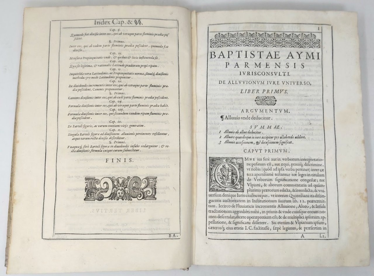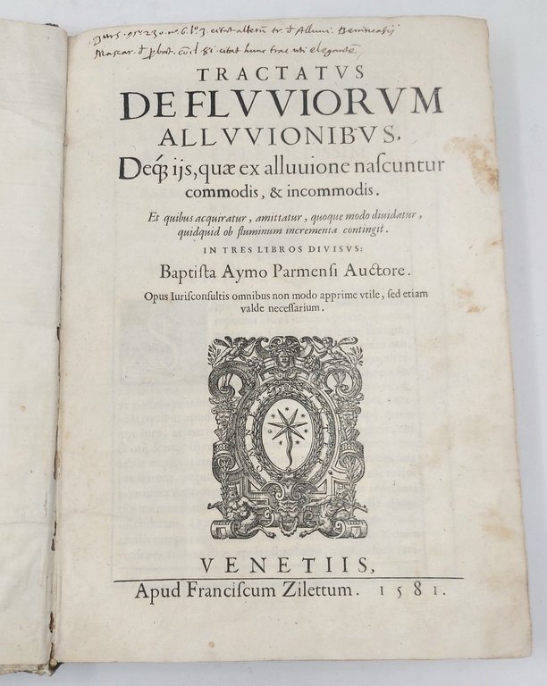 >in-folio, pp. (20), 307, (25), leg. coeva p. perg., sui piatti foglio di antifonario trecentesco manoscritto in car. gotico su due colonne con iniz. in rosso e blu, tit. ms. al dorso (restaurato). Impresa tip. al tit., fregi silogr., belle iniz. istor., ogni pag. ''reglée''. Dediche dell'a. al Duca di Parma Ottavio Farnese, ai Quaranta Signori del Senato di Bologna ed al Collegio dei Gireconsulti di Parma. Prima edizione di opera rarissima sulla scienza idraulica, corredata di 2 tav. xilogr. ripieg. f.t. e 11 fig. n.t. Essa affronta ampiamente, dal punto di vista scientifico e giuridico, il tema delle alluvioni, delle inondazioni e delle conseguenti modificazioni subite dall'ambiente circostante. Non si sono trovate notizie bio-bibliografiche sull'autore, che sicuramente era nativo di Bologna. Ottimo esempl. (con postille marginali di mano coeva qua e là e frequenti sottolineature). Manca al Diz. Biogr. Ital. Riccardi, parte V, col. 4 (cita ediz. poster.). STC. 65.