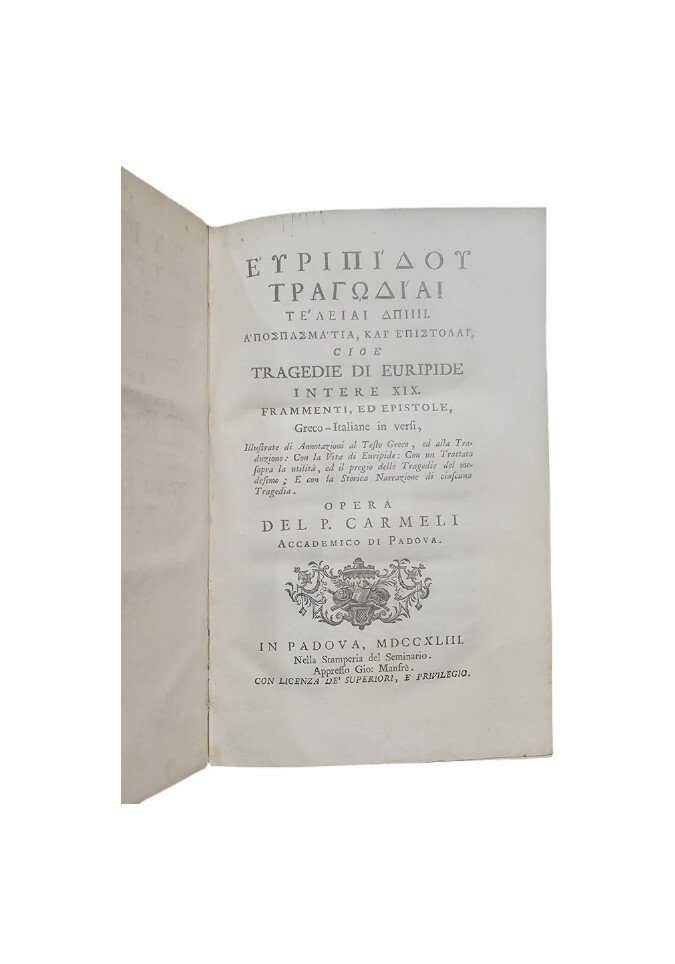 Primo volume: Tragedie di Euripide intere XIX frammenti ed epistole greco-italiane in versi Opera del P. Carmeli accademico di Padova Anno 1743 / Ecuba - Oreste di Euripide