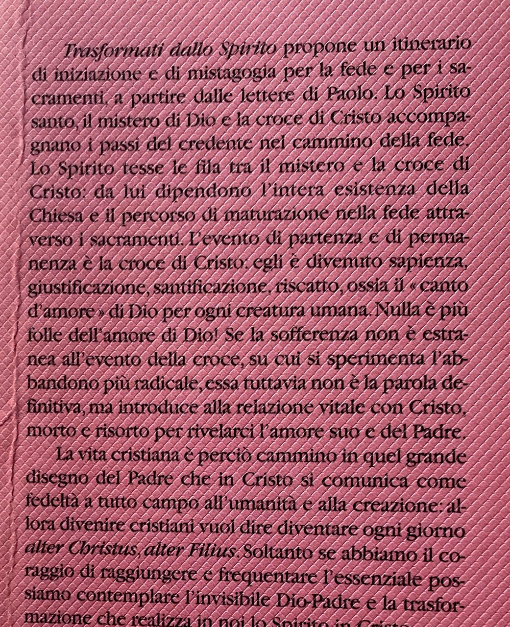 Trasformati dallo Spirito propone un itinerario di iniziazione e di mistagogia per la fede e per i sacramenti, a partire dalle lettere di Paolo. Lo Spirito santo, il mistero di Dio e la croce di Cristo accompagnano i passi del credente nel cammino della fede. Lo Spirito tesse le fila tra il mistero e la croce di Cristo: da lui dipendono l'intera esistenza della Chiesa e il percorso di maturazione nella fede attraverso i sacramenti. L'evento di partenza e di permanenza e la croce di Cristo, egli è divenuto sapienza, giustificazione, santificazione, riscatto, ossia il canto d'amore di Dio per ogni creatura umana. Nulla è più Folle dell'amore di Dio! Se la sofferenza non è estranea all'evento della croce, su cui si sperimenta l'abbandono più radicale, essa tuttavia non è la parola definitiva, ma introduce alla relazione vitale con Cristo, morto e risorto per rivelarci l'amore suo e del Padre. La vita cristiana è perciò cammino in quel grande disegno del Padre che in Cristo si comunica come fedeltà a tutto campo all'umanità e alla creazione: allora divenire cristiani vuol dire diventare ogni giorno alter Christus alter Filius. Soltanto se abbiamo il coraggio di raggiungere e frequentare l'essenziale possiamo contemplare l'invisibile Dio-Padre e la trasformazione che realizza in noi lo Spirito in Cristo.