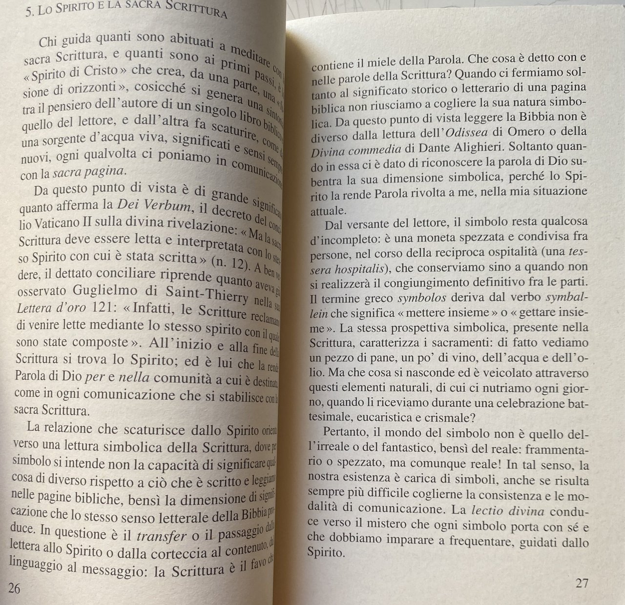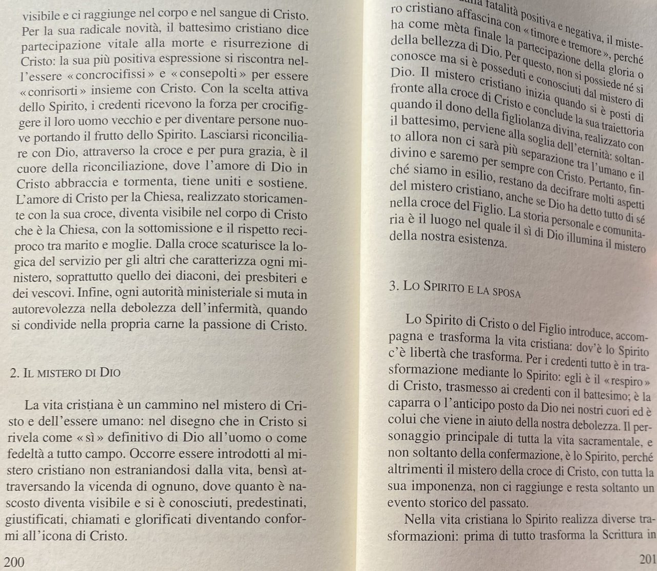 Lo Spirito tesse le fila tra il mistero e la croce di Cristo: da lui dipendono l'intera esistenza della Chiesa e il percorso di maturazione nella fede di ogni credente, attraverso i sacramenti rievangelizzati. La lectio divina, lettura orante gratuita della scrittura accolta come parola di Dio, si sviluppa, sotto lo stimolo dello Spirito santo, in meditazione preghiera e contemplazione.