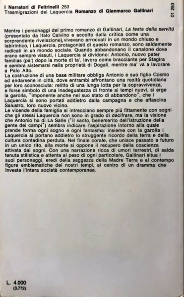 Soggetti: Narrativa, Letteratura italiana contemporanea, Libri Vintage, Fuori catalogo, La festa della servitù, Romanzi sociali, Saghe, Palo Alto, California, Contadini, Vita quotidiana, Lotta per la Sopravvivenza, Gente dei campi, Madre Terra, Cultura contadina, Drammatici, Istruzione, Saggezza, Società, Alienazione, Trasmigrazione, Viaggio, Migranti, America, Braccianti, Multinazionali, Santa Clara, Ranchos, San Francisquito Creek, Racconti, Fiction, Contemporary Italian literature, Out of print books, The feast of servitude, Social novels, Sagas, Peasants, Daily life, Struggle for Survival, People of the fields, Mother Earth, Peasant culture, Drama, Education, Wisdom, Society, Alienation, Transmigration, Travel, Migrants, Laborers, Multinationals, Tales