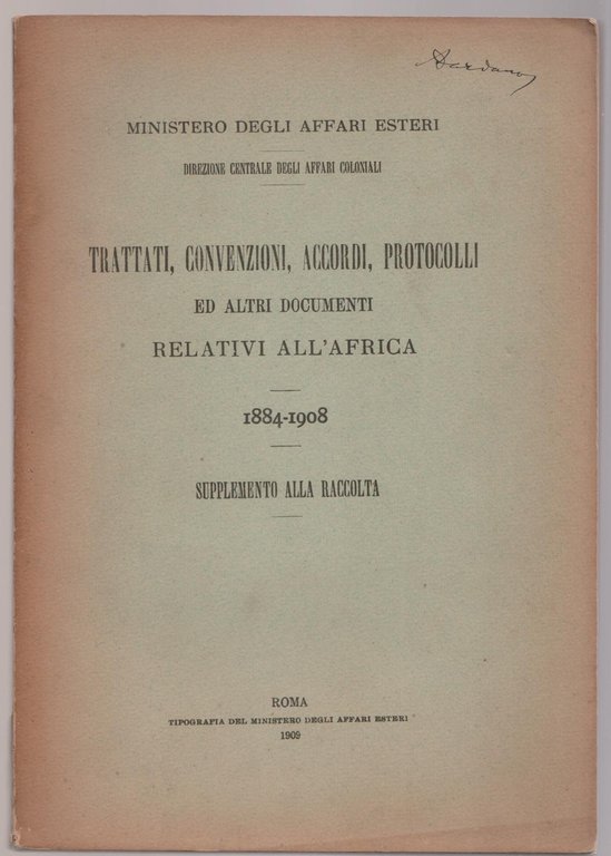 Trattati convenzioni accordi protocolli ed altri documenti relativi alla teca 1884 1908 supplemento alla raccolta Ministero degli Affari Esteri 1909
