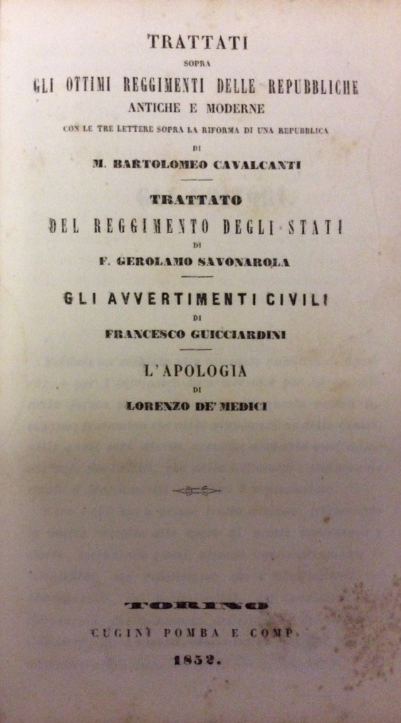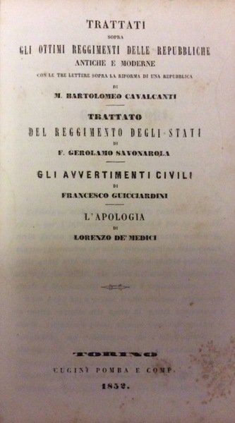 In-16 p. (mm. 170x102), 4 opere in 1 vol., mz. pelle coeva, fregi e titolo oro al dorso, pp. 260,(2). Vi sono contenuti, oltre ai trattati di Cavalcanti: il Trattato del reggimento degli stati, di G. Savonarola (con notizie sulla sua vita) - il Discorso a Papa Clemente VII e Gli avvertimenti civili di Francesco Guicciardini - L'apologia di Lorenzo de' Medici. Volume della collana Nuova Biblioteca Popolare - Classe IV. Politica.Qualche fiorit. interc. nel testo, ma in buono stato.