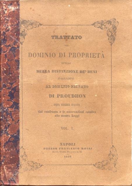 TRATTATO DEL DOMINIO DI PROPRIETA' OVVERO DELLA DISTINZIONE DEI BENI IN RELAZIONE AL DOMINIO PRIVATO. Edizione aumentata nel Belgio del confronto dell'opera coi trattati dei signori Hennequin, Chavot, Duranton, Toullier, Merlin, Rolland de Villargues, Demante, Boileux, Zachariae, Deleurie, Fed. Taulier, Championnière e Rigaud, Favard de Langlade, O. Leclercq, Petit, ecc. Della bibliografia e del comento contenente le sorgenti, il sunto delle discussioni legislative, la legislazione straniera comparata, seguìta dalla sinossi della materia ed annotata della giurisprudenza delle corti di Francia e del Belgio. Prima versione italiana col confronto e le osservazioni relative alle Leggi delle Due Sicilie per cura di Giuseppe Cioffi.