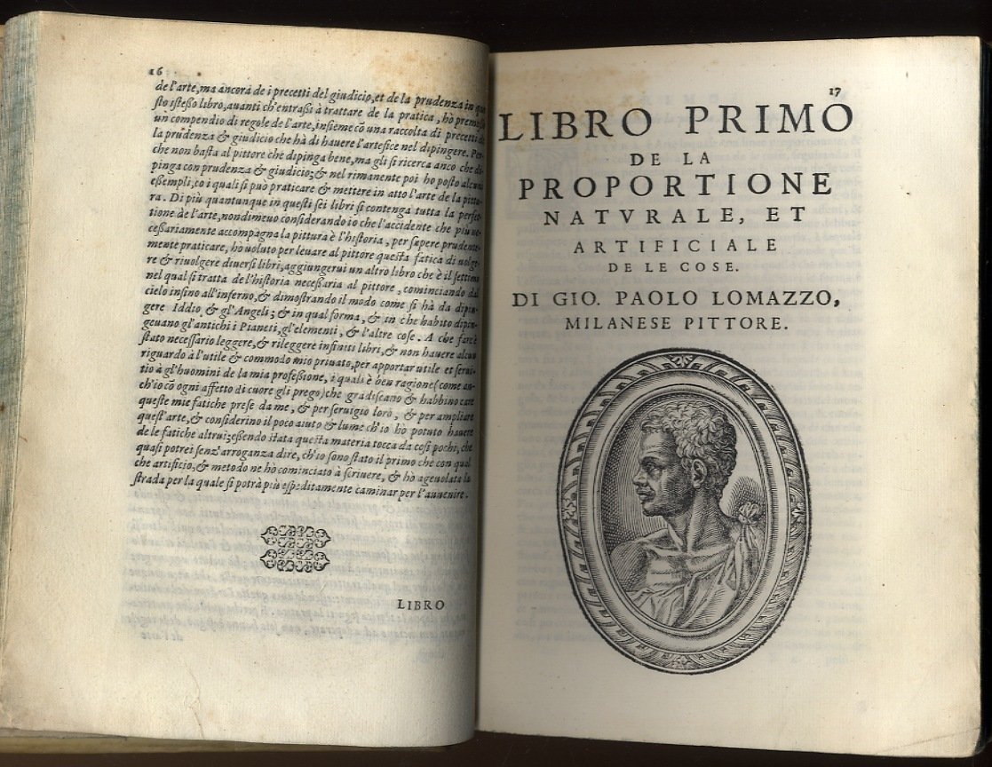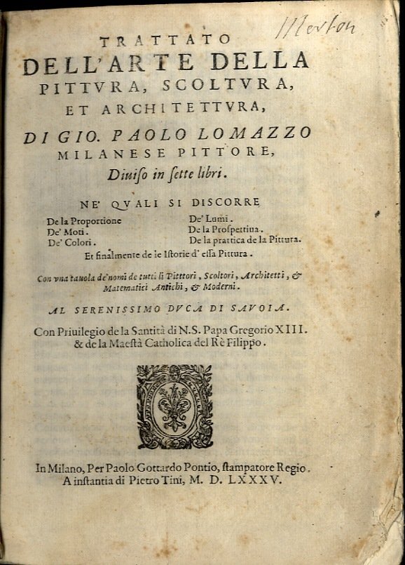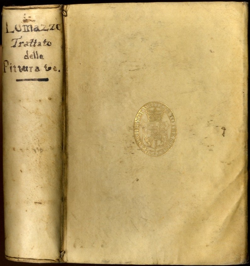 >in-4 (215x160), pp. (40), 700, (2, errata corrige), leg. coeva in pergamena, titolo ms. al dorso, ai piatti stemma in oro della ''Society of Writers to Her Majesty's Signet'', fondata nel 1594. Ritratto dell'autore in ovale silogr. all'inizio del libro I. Dedica a Carlo Emanuele I di Savoia. Prima edizione, seconda tiratura, di questo celebre libro, considerato ''la Bibbia del Manierismo''. Lomazzo (Milano 1538-1600) concepì l'opera come una fonte universale per i pittori ed influenzò enormemente tutta la critica artistica europea. Gli ultimi due capitoli sono di fondamentale importanza per lo studio del manierismo e per le notizie sui pittori milanesi. Il primo libro tratta delle proporzioni del corpo umano e degli ordini architettonici; il secondo delle passioni; il terzo dei colori; il quarto della luce e dell'ombra; il quinto della prospettiva lineare; il sesto ha per materia l'applicazione pratica delle regole esposte in precedenza; l'ultimo è un utile trattatello d'iconografia. Mentre l'edizione con frontespizio datato 1584 era in corso di stampa l'editore ricompose qualche foglio del primo fascicolo, aggiungendo al titolo ''Ne' quali si discorre de la proportione, de moti, de colori, de lumi, de la prospettiva, de la pratica de la pittura, et finalmente de le istorie d'essa pittura''. Esemplare assai fresco, sulla sguardia posteriore nota di possesso ''Giacomo Cachopin de Laredo amatore della virtù et dell'arte della pittura''; è curioso notare che tale nome è citato nel capitolo XIII del Quichote (''Quantunque la mia famiglia sia dei Cachopín di Laredo, non oserò metterla a confronto con quella dei Toboso della Mancha''). Schlosser-Magnino pp. 395. Blunt pp. 138-159. Cicognara 159 . Berlin Cat. 4612. Hoepli 1278. Predari 439. STC. 391. Adams L-1419.