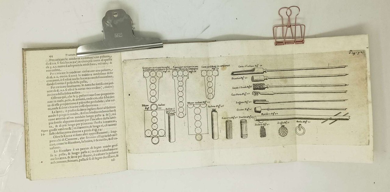 >in-4 (mm 215x160), pp. (6 su 8, manca l'occhietto), 68, (6), legatura coeva in pergamena. Con 6 tavole incise in rame di cui 5 ripiegate (e rinforzate) e 2 tav. numeriche f.t. Prima edizione di questo trattato diviso in cinque parti: ''Le cose comuni ad ogni Artiglieria'', ''Della formazione delle canne'', ''Della formazione dei letti'', ''Della carica'', ''Dei tiri''; si conclude con un'appendice sul petardo. Il testo è preceduto da una serie di definizioni geometriche, propedeutiche alla trattazione e utilizzabili ''per ornamento nel discorrere, a qual si sia persona di qualità'' (c. 4v). Il nobile Bresciano Tommaso Moretti, ingegnere della Repubblica di Venezia, è stato uno dei più grandi esperti di arte militare del XVII sec.