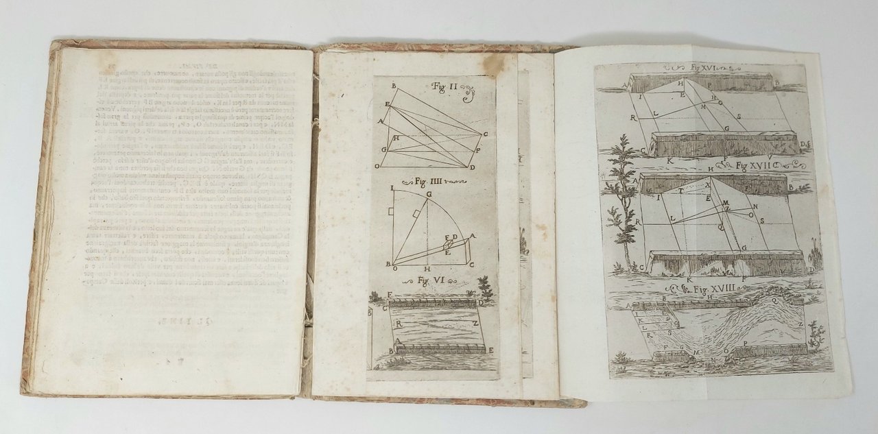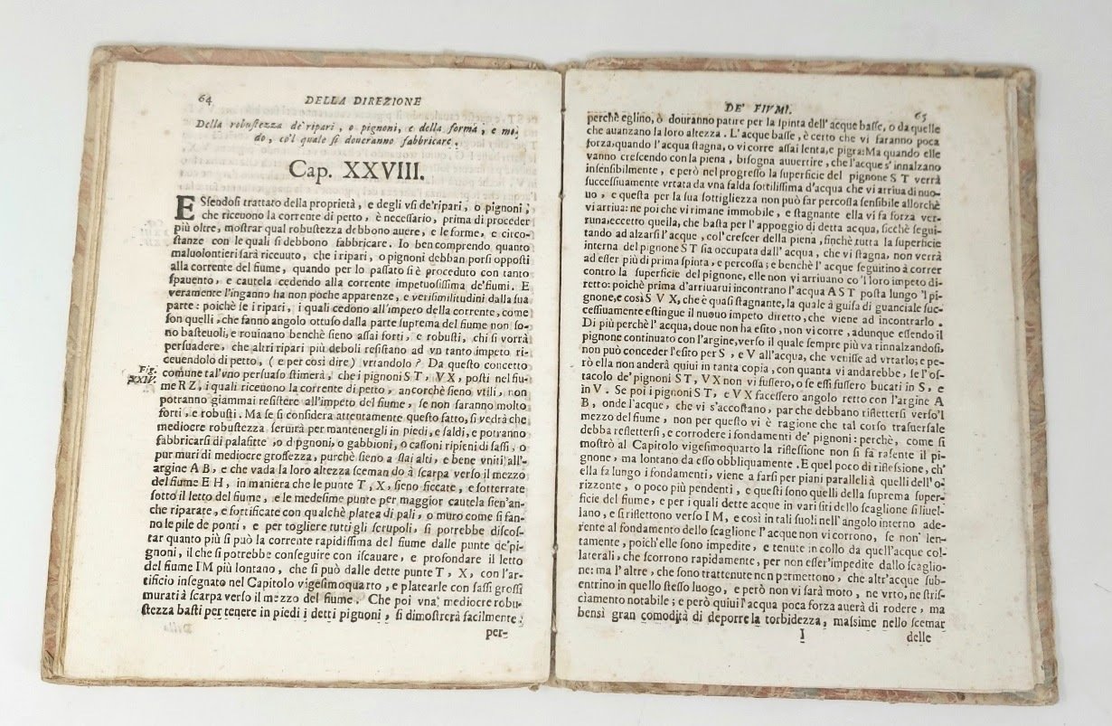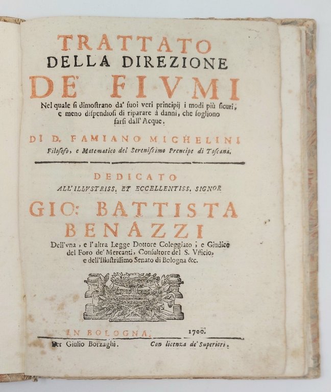 >in-4, pp. (8), 75, legatura coeva in cart. decorato. Front. a stampa rossa e nera, iniz. e fregi silogr. Dedica dello stampatore a G.B. Benazzi. Con 9 tavole incise illustranti 31 figure. Seconda edizione (la prima apparve a Firenze nel 1664) di quest'opera sui fiumi e le varie problematiche inerenti ad essi, che "esamina il flusso, la resistenza e le caratteristiche di portata di diversi tipi di fiumi. Molti dei capitoli successivi sono dedicati alle tecniche per modificare il corso o le caratteristiche di scorrimento di un fiume, per prevenire le inondazioni" (cfr. Roberts-Trent). L'autore (1592-1666) fu professore di matematica all'Università di Pisa, amico di Galileo e di Benedetto Castelli e godette di grande reputazione in campo idraulico. Buon esemplare- Roberts-Trent, Bibl.Mechanica, 224 (ed. 1664): «discusses flow, resistance, flow characteristics of different sort of rivers. Many of the later chapters are devoted to techniques for altering the course or the flow characteristics of a river, preventing flooding, etc.». Riccardi 156, Gamba 2012 e Razzolini 236 (tutti per la I ed.).