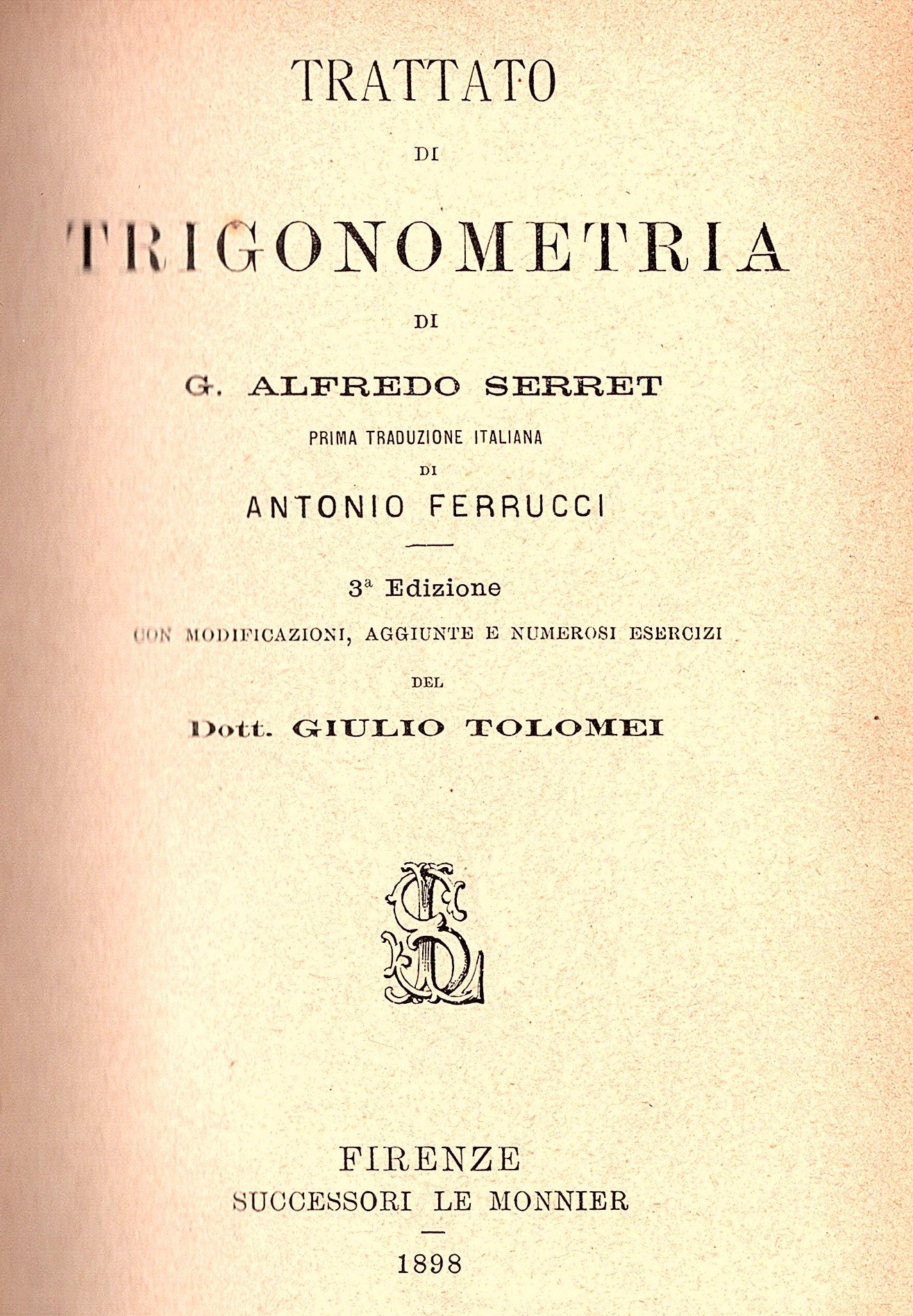 Trattato di trigonometria di G. Alfredo Serret. Prima traduzione italiana di Antonio Ferrucci. Terza edizione con modificazioni, aggiunte e numerosi esercizi del dott. Giulio Tolomei LEGATO insieme a Trattato di trigonometria piana e sferica, versione dal francese corretta e accresciuta di note per Camillo Zocchi