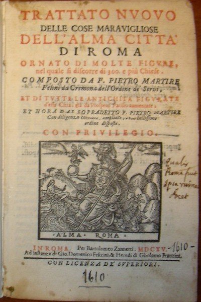 TRATTATO NUOVO delle cose meravigliose dell’alma città di Roma. Ornato di molte figure nel quale di discorre di 300 e più chiese composto da. da Cremona dell’Ordine dei Servi, e di tutte le antichità figurate d’essa città già da Prospero Parisio aumentate ed ora dal sopraddetto. con diligenza corrette, ampliate e in bellissimo ordine disposte.
